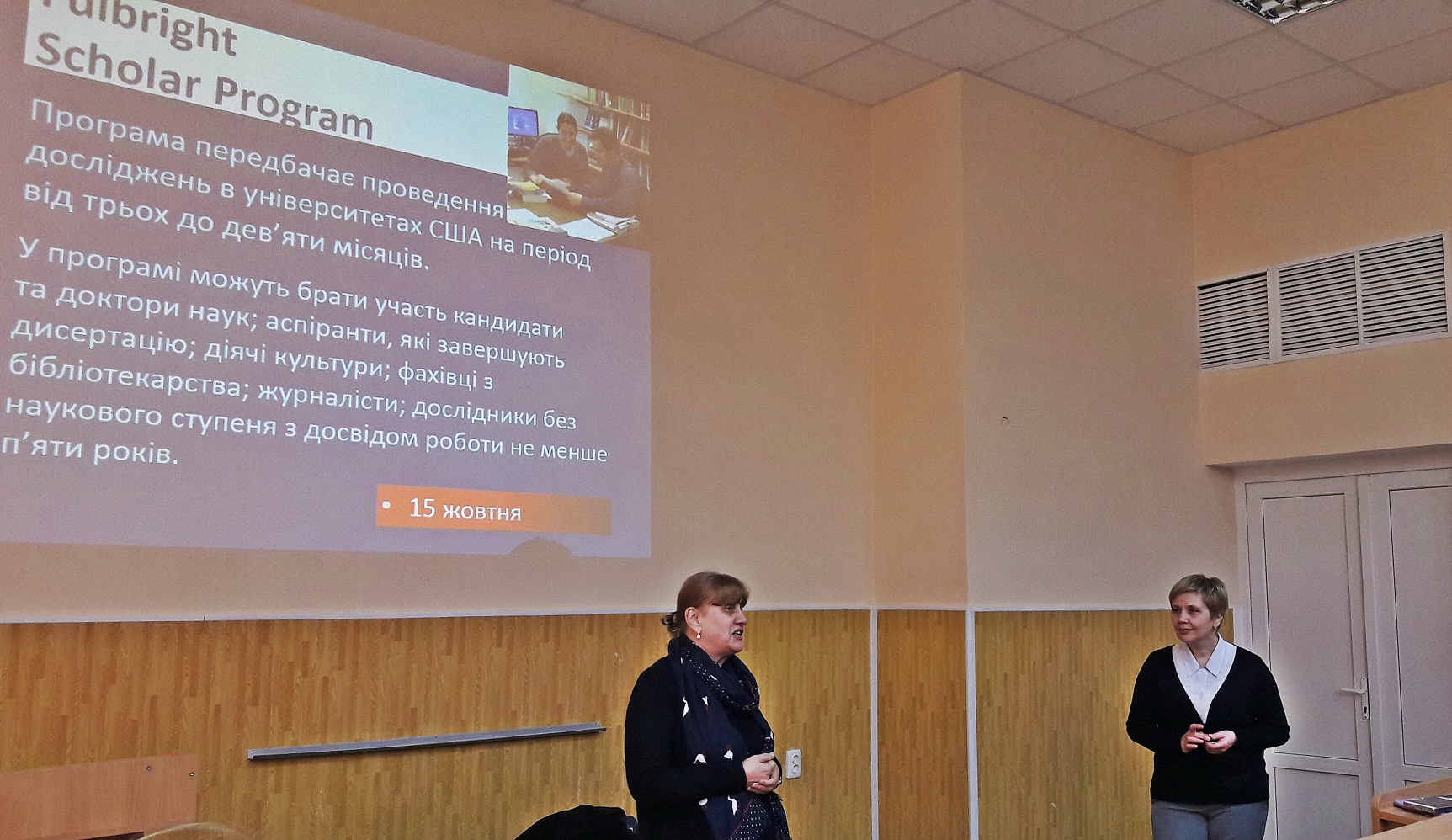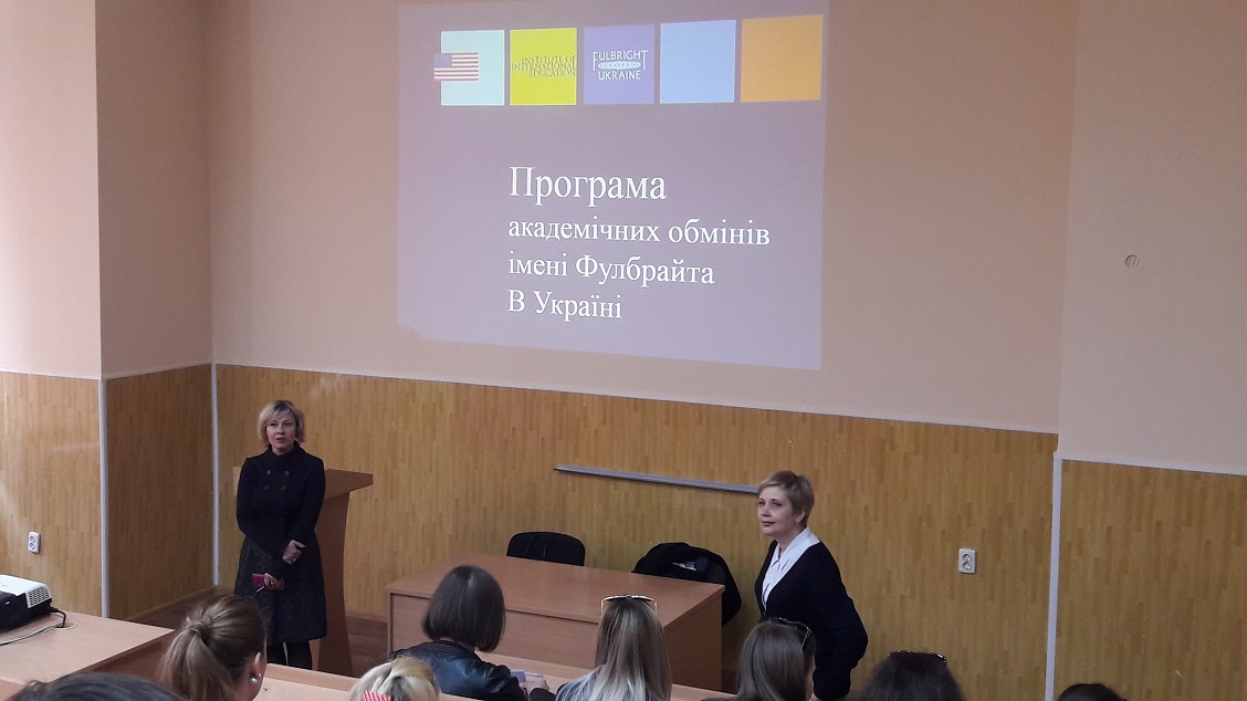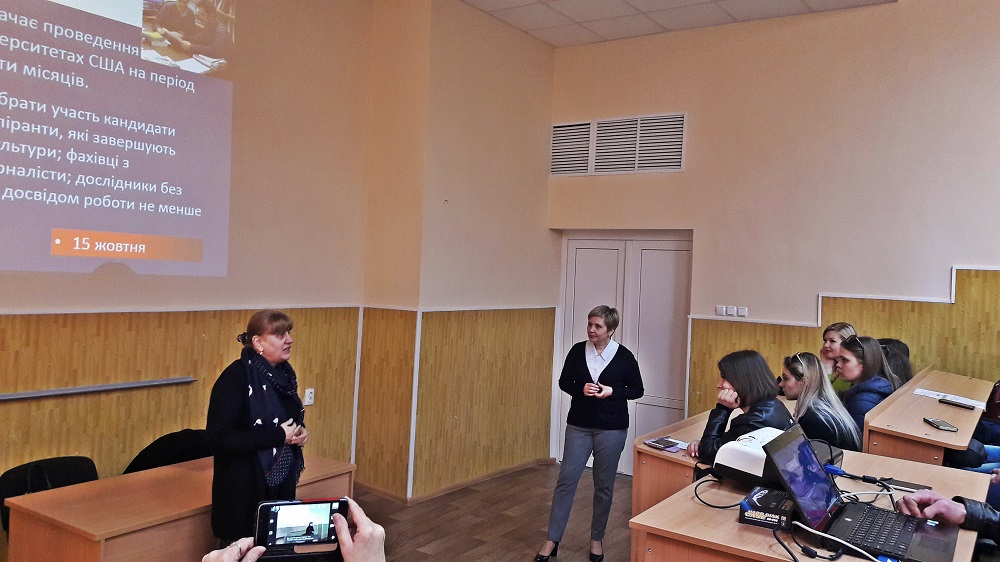 Координатор Програми в Україні пані Інна Бариш представила програми наукового стажування та проведення досліджень в університетах США для аспірантів, викладачів і молодих вчених. Присутні дізналися про умови та перспективи участі у грантових проектах.