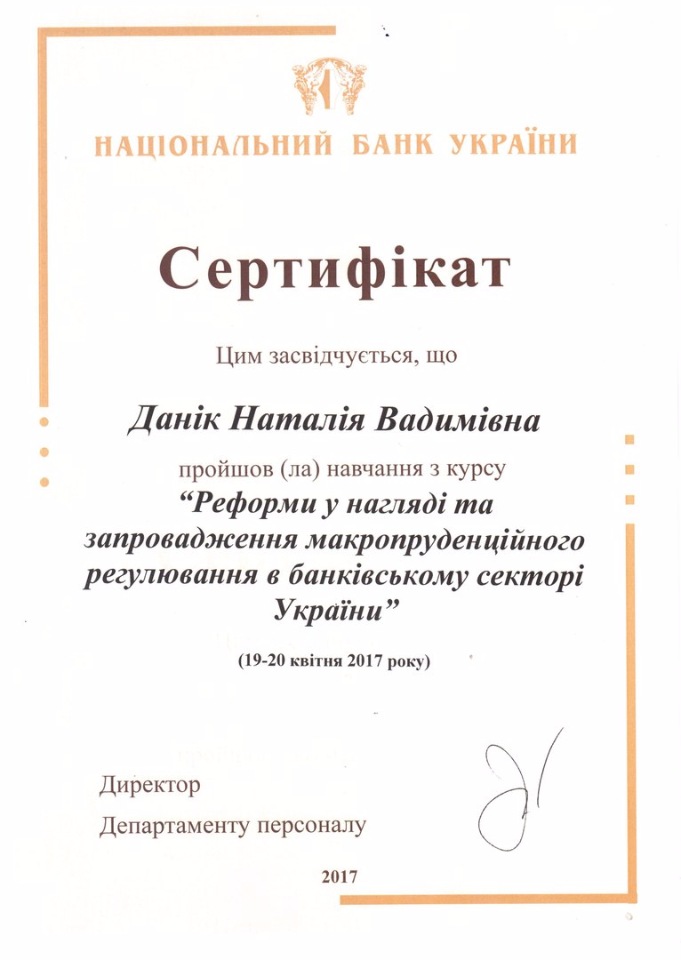 19-20 квітня доцент кафедри фінансів, банківської справи та страхування факультету економіки Данік Н. В. взяла активну участь у роботі освітнього семінару «Реформи у нагляді та запровадження макропруденційного регулювання в банківському секторі України», що відбувся за підтримки НБУ.