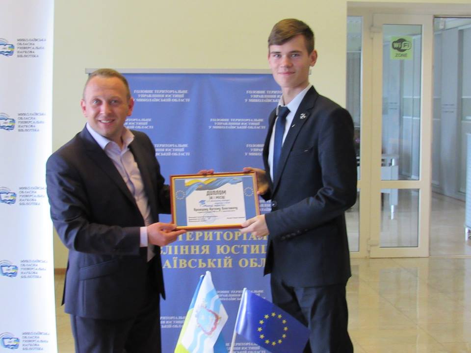 За результатами Артем посів І місце та отримав почесний диплом від начальника Головного територіального управління юстиції в Миколаївській області Возняка Р. І.
