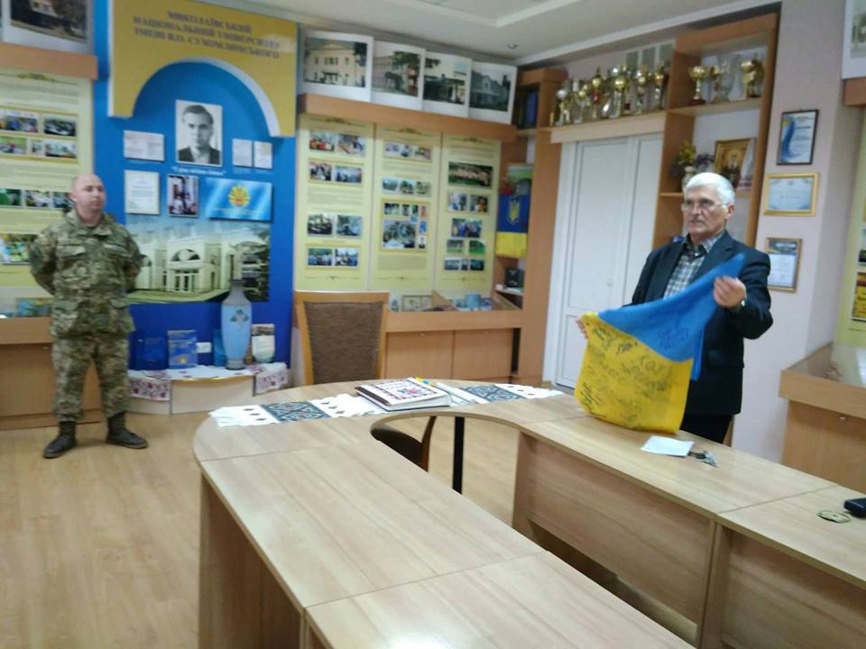 У ході зустрічі Максим Анатолійович урочисто передав Прапор нашої держави, з яким перебували бійці бригади на передових позиціях, до Музею нашого університету.