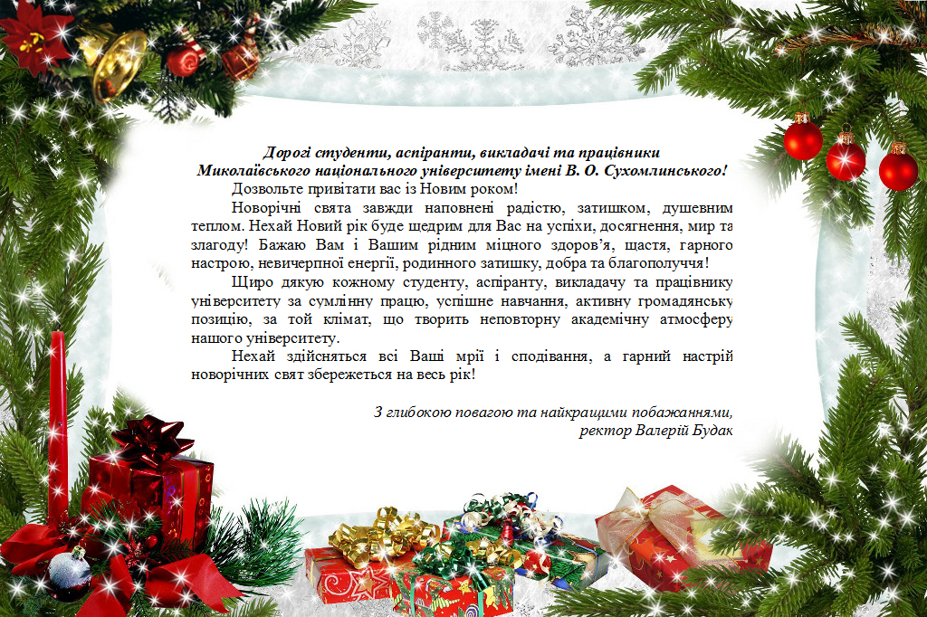 Привітання ректора Миколаївського національного університету імені В. О. Сухомлинського з Новим Роком Якщо ви знайшли помилку, будь ласка, виділіть фрагмент тексту та натисніть Ctrl+Enter.