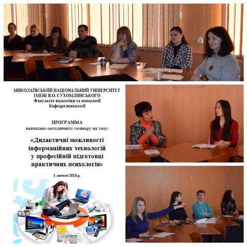1 лютого 2018 р. викладачем кафедри психології Л. А. Опанасенко організовано та проведено навчально-методичний семінар «Дидактичні можливості інформаційних технологій у професійній підготовці практичних психологів».