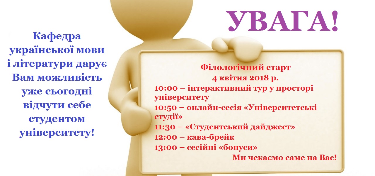 Увага! Кафедра української мови і літератури дарує Вам можливість уже сьогодні відчути себе студентом університету! Якщо ви знайшли помилку, будь ласка, виділіть фрагмент тексту та натисніть Ctrl+Enter.