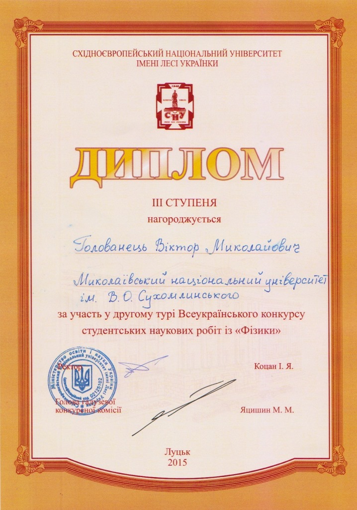 Студент механіко-математичного факультету Голованець Віктор Миколайович здобув перемогу та нагороджений дипломом третього ступеня за участь у ІІ турі Всеукраїнського конкурсу студентських наукових робіт з фізики, який проходив у Східноєвропейському національному університеті імені Лесі Українки (м. Луцьк) з 19 по 21 березня 2015 р.