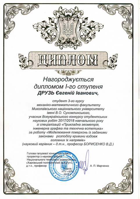 ДРУЗЬ Євгеній Іванович, студент групи 382 (науковий керівник – професор БОРИСЕНКО В.Д.) – посів І місце;