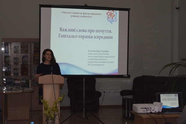 Консультант психологічної консультації Центру психологічної служби Миколаївського національного університету імені В.О. Сухомлинського Гулькова Д. С. у доповіді «Важливі слова про почуття. Гештальт-терапія зсередини» розкрила аспекти своєї практичної діяльності у взаємовідносинах з викладачами та студентами.