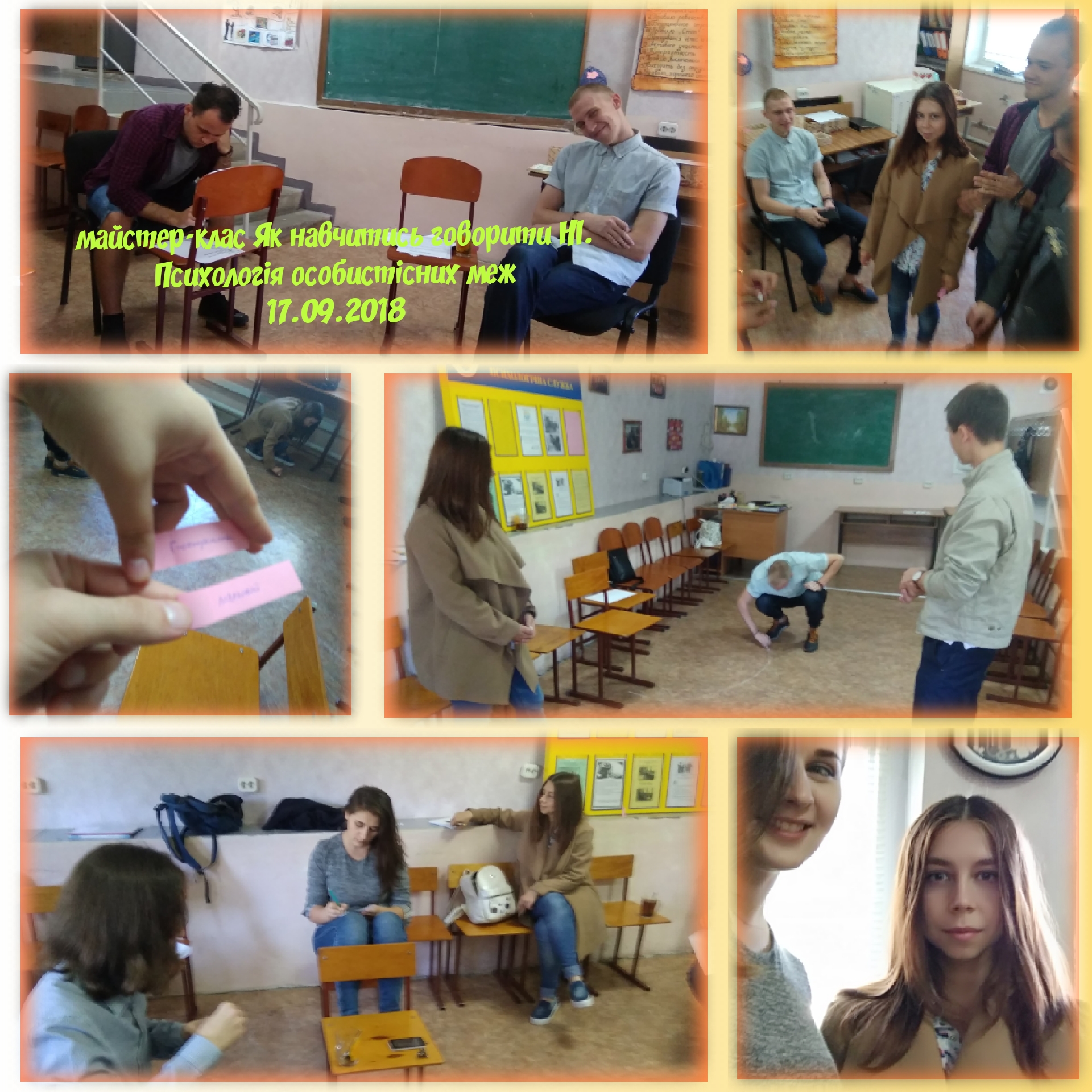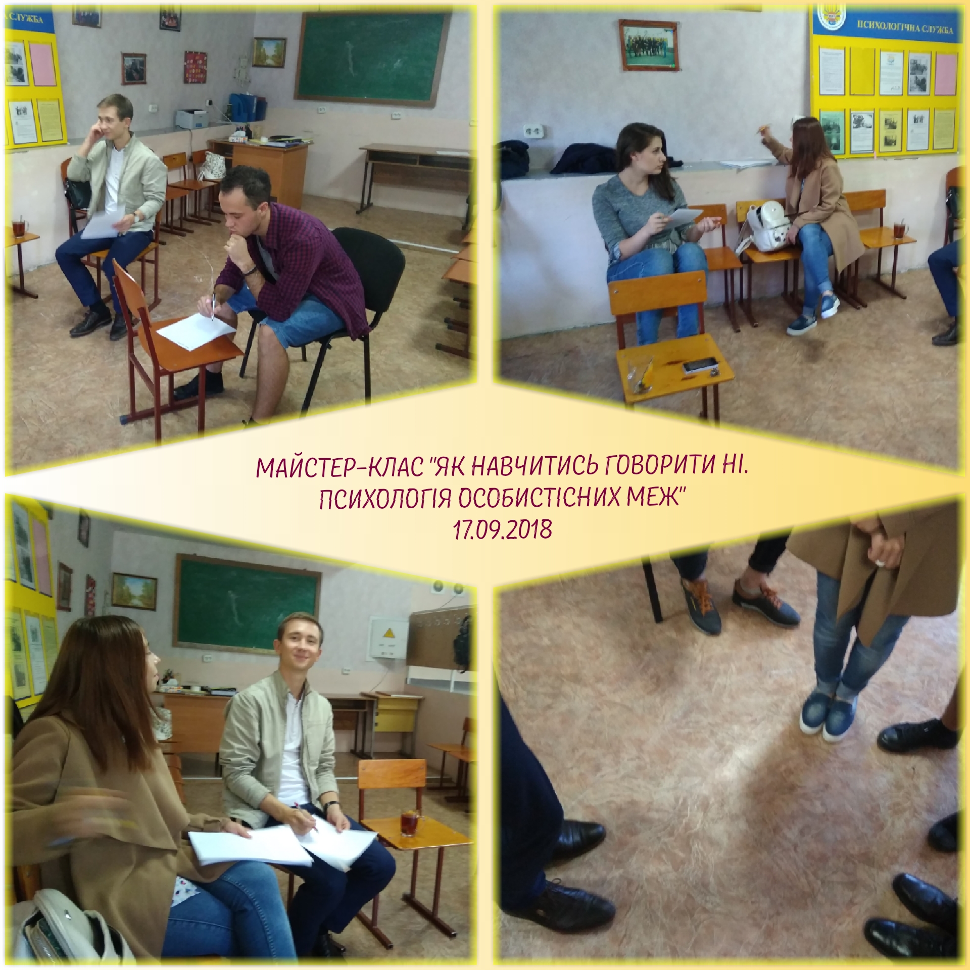 17 вересня 2018 року в рамках роботи Психологічної служби університету відбувся майстер-клас “Як навчитись говорити ні. Психологія особистісних меж ” зі студентами 674 групи спеціальності “Політологія” та 514 групи спеціальності “Історія та право. Середня освіта” історичного факультету та зі студентами 217 та 517 групи спеціальності “Психологія” факультету педагогіки та психології.