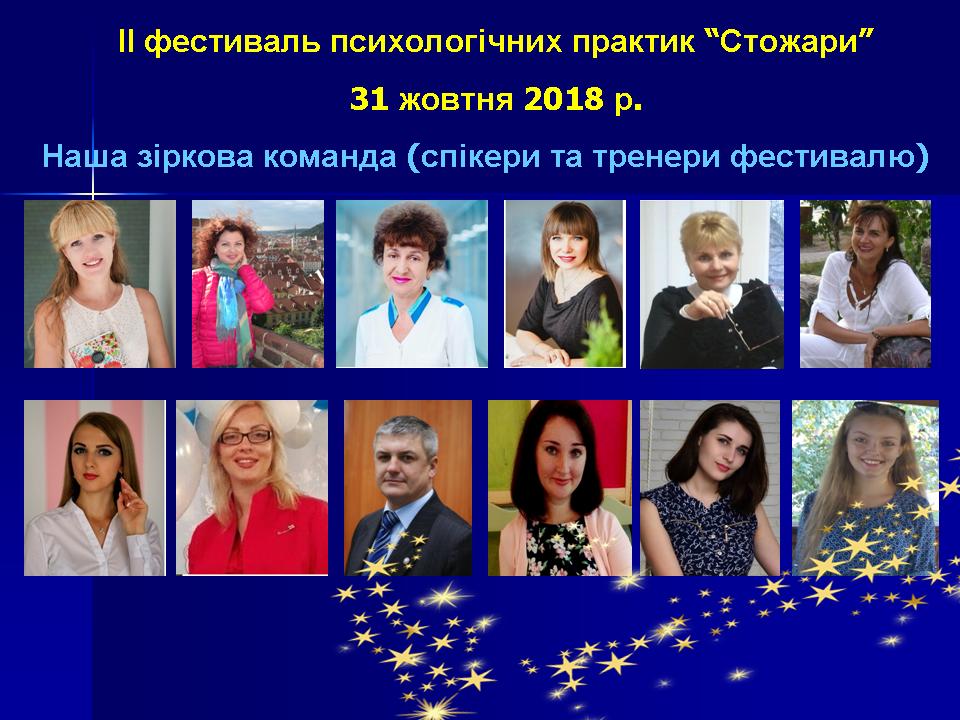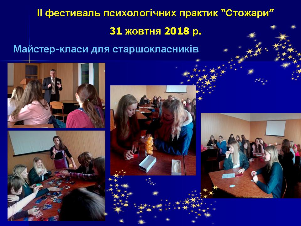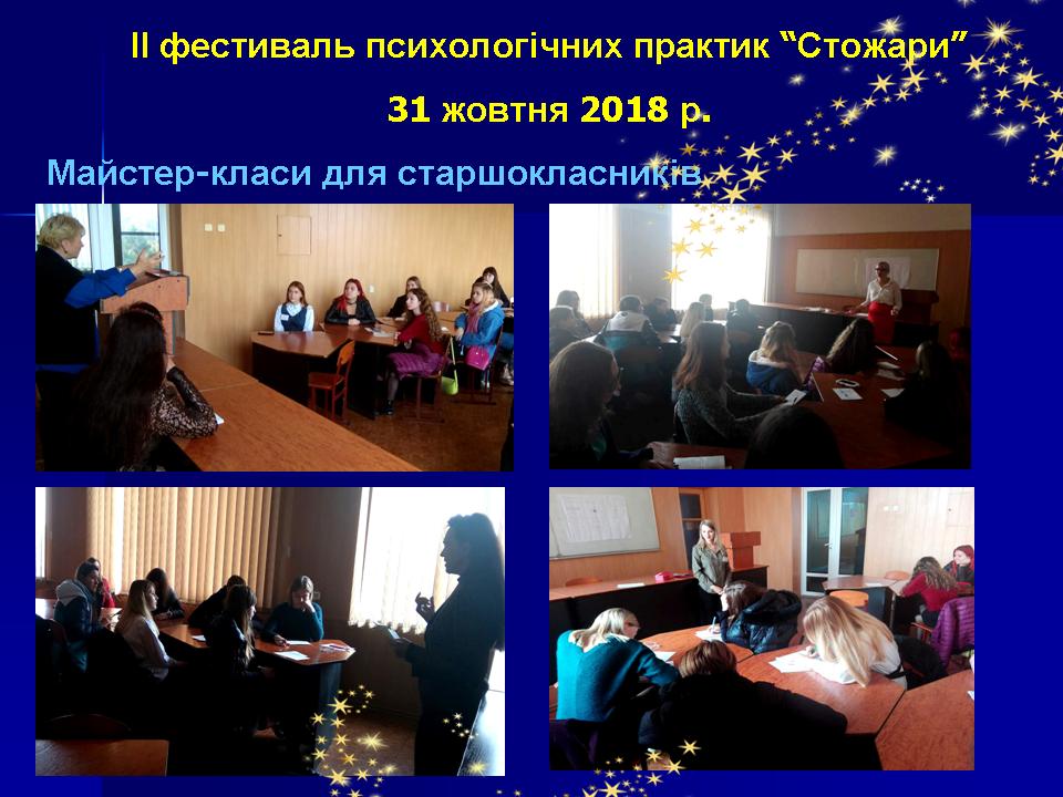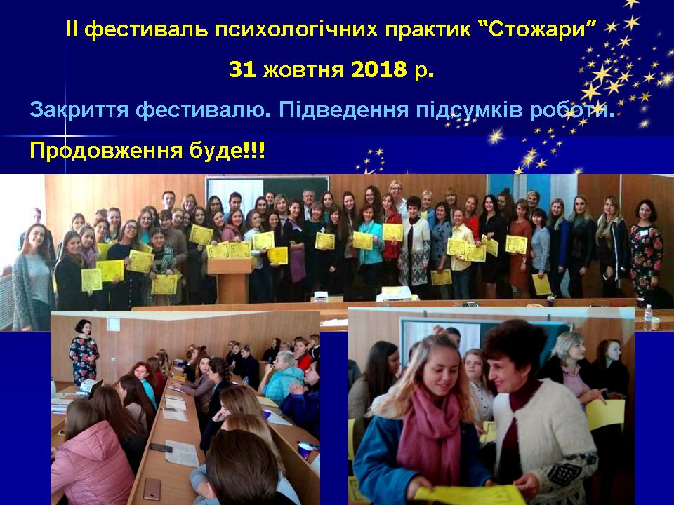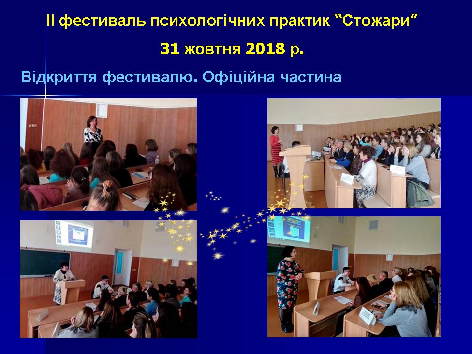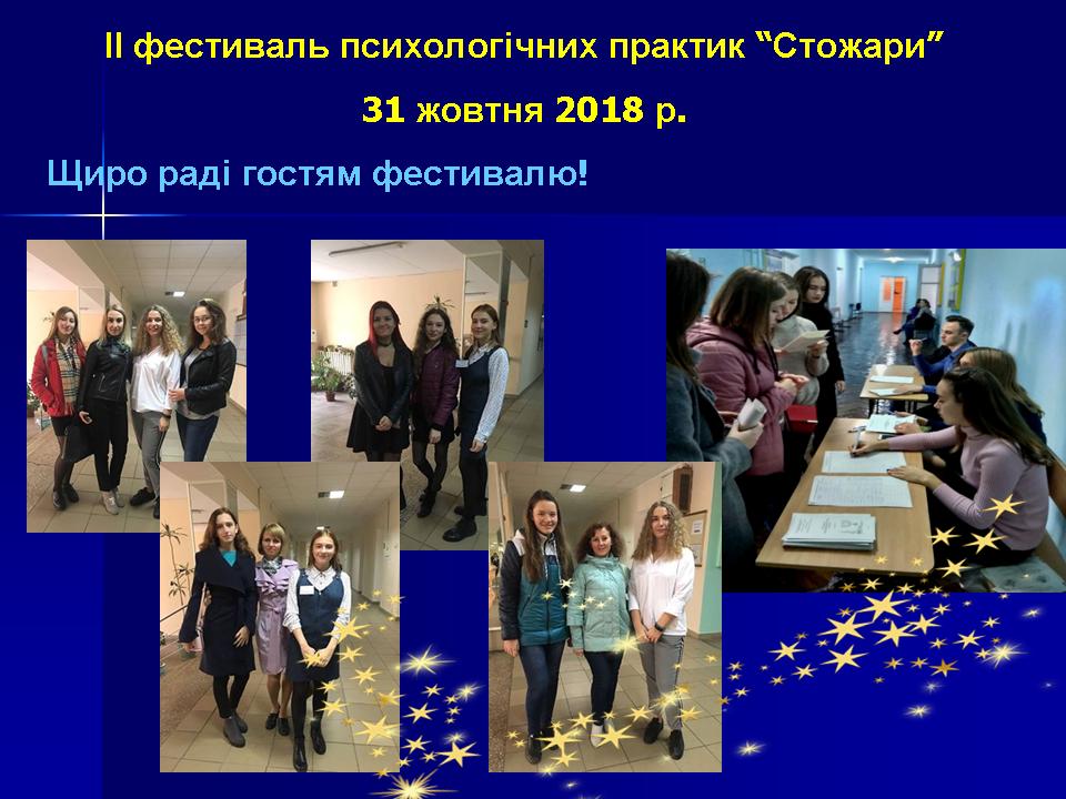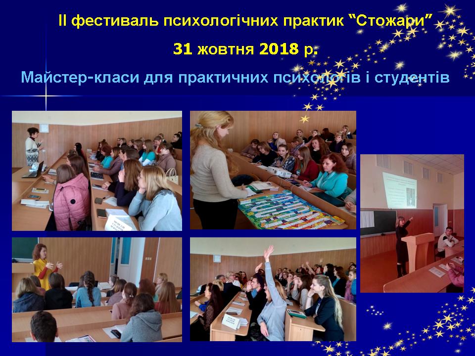 31 жовтня 2018 р. на факультеті педагогіки та психології Миколаївського національного університету імені В. О. Сухомлинського відбувся ІІ фестиваль психологічних практик «Стожари». Фестиваль психологічних практик «Стожари» – це калейдоскоп майстер-класів та тренінгових занять, який презентує розмаїття сучасних психологічних підходів, методів, технік та ідей; спрямований на обмін практичними напрацюваннями, популяризацію діяльності практичного психолога, свідомий виріб професії психолога.