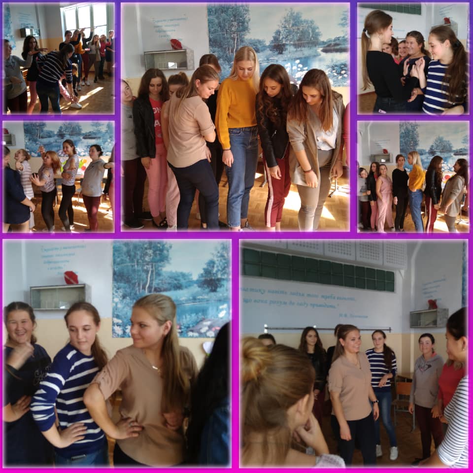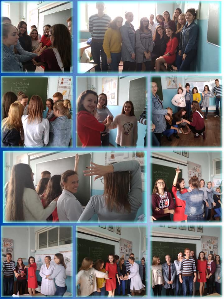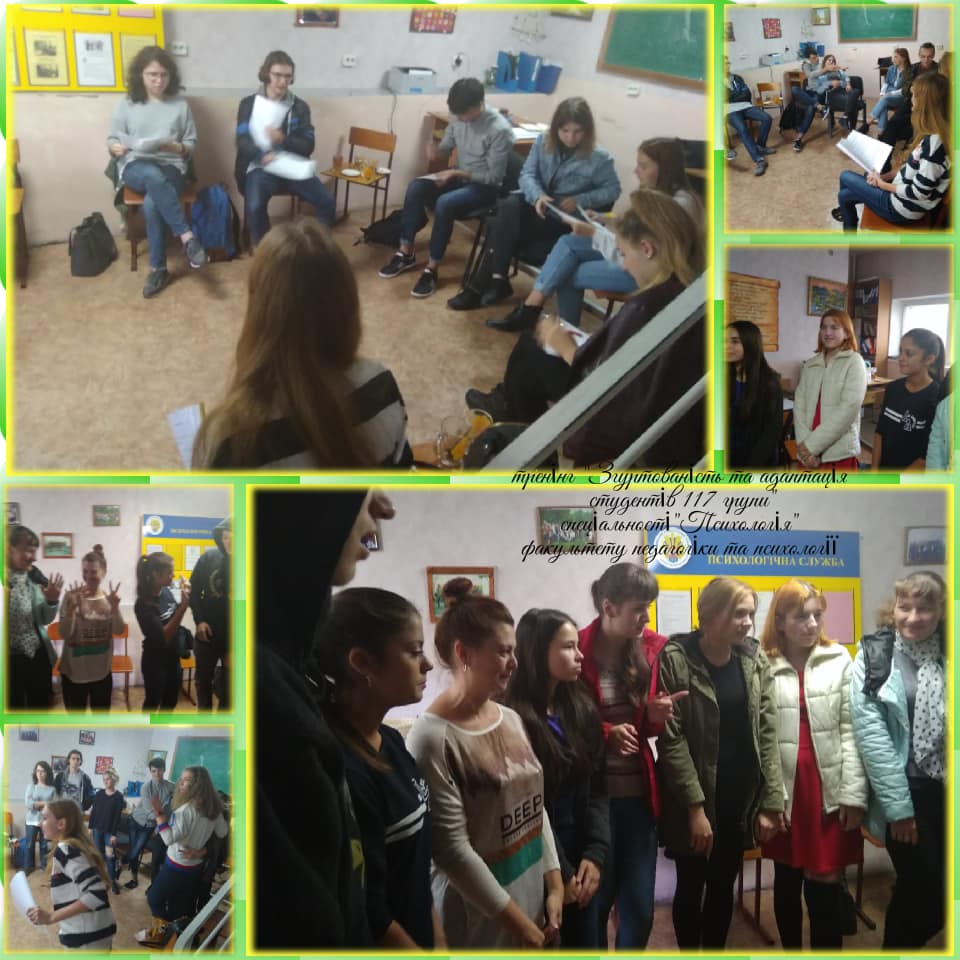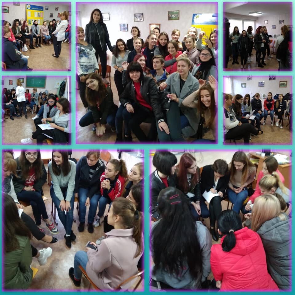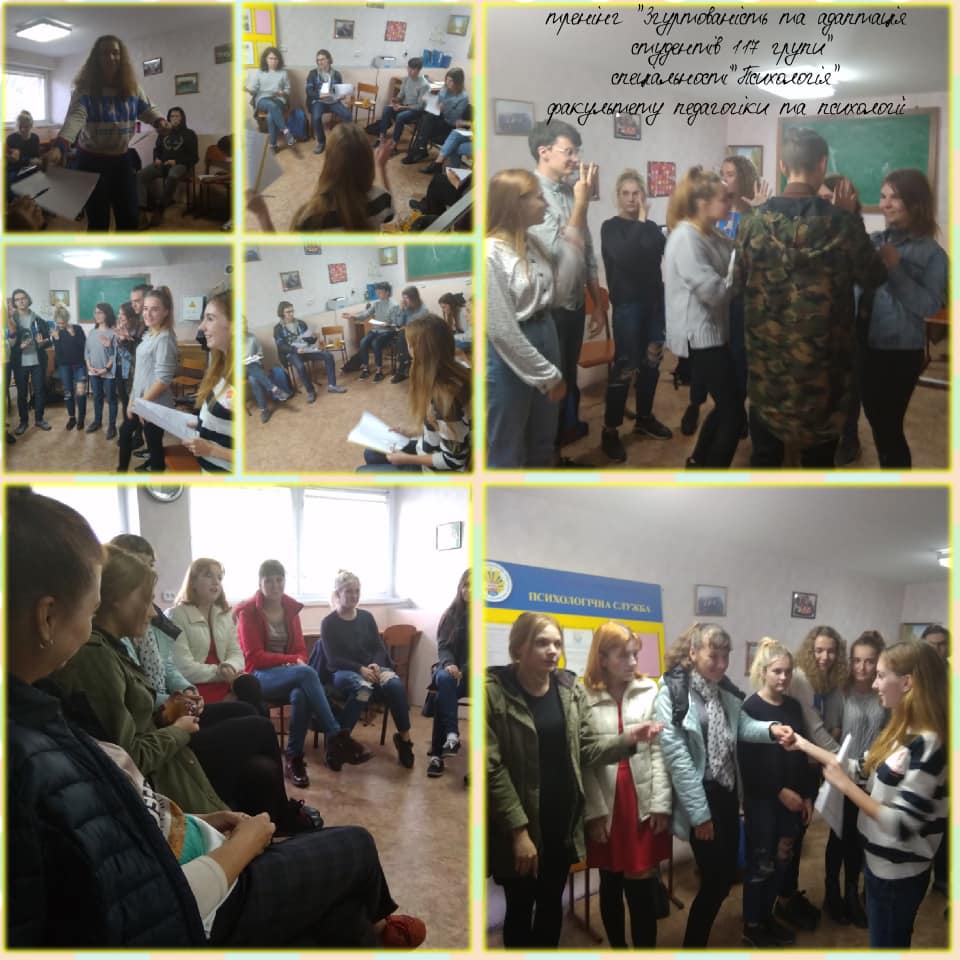 Впродовж жовтня місяця 2018 року зі студентами-першокурсниками 130 та 140 груп спеціальностей “Біологія.Середня освіта” та “Біологія та хімія” кафедри лабораторна діагностика та кафедри біологія та хімія; 117 групи спеціальності “Психологія”, 167 групи спеціальності “Логопедія” факультету педагогіки та психології; 125 та 325 групи спеціальності “Соціальна робота” та та зі 115 групою спеціальності “Право” коледжу МНУ імені В.О. Сухомлиського їх кураторами були проведені цикли тренінгових занять на тему “Згуртованість та адаптація студентів-першокурсників”