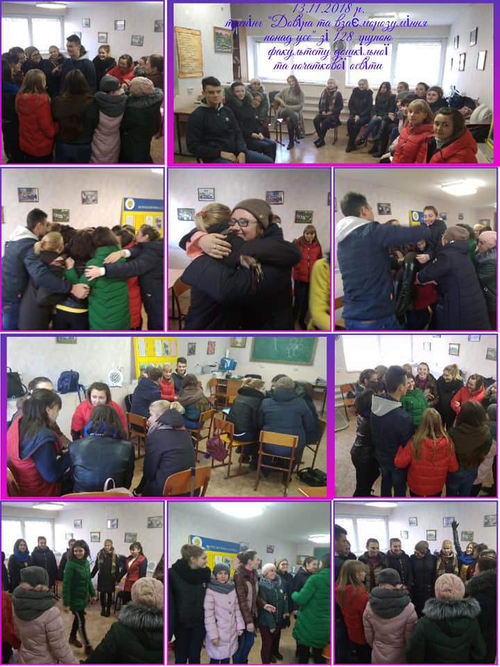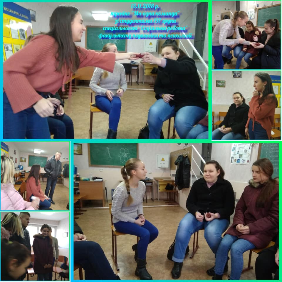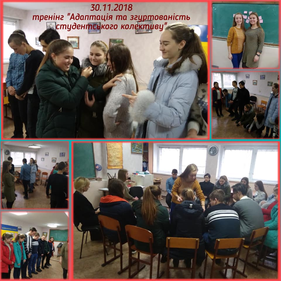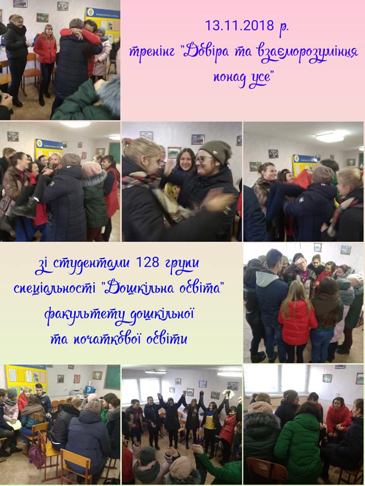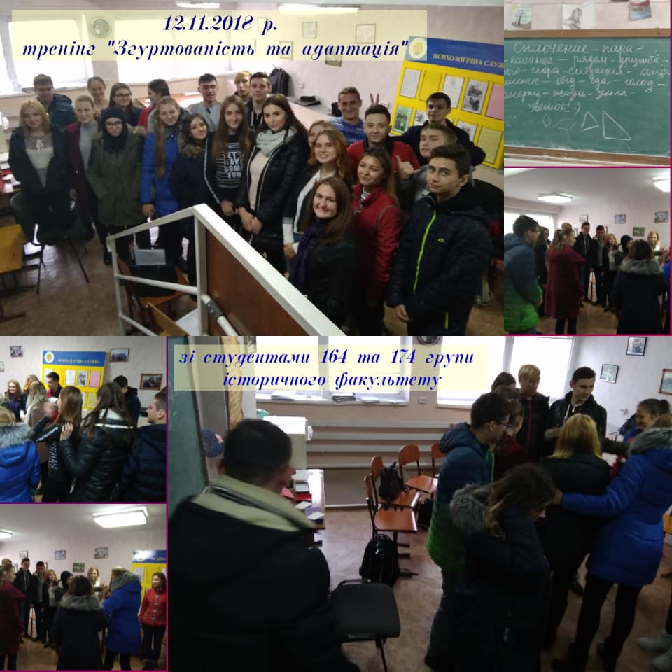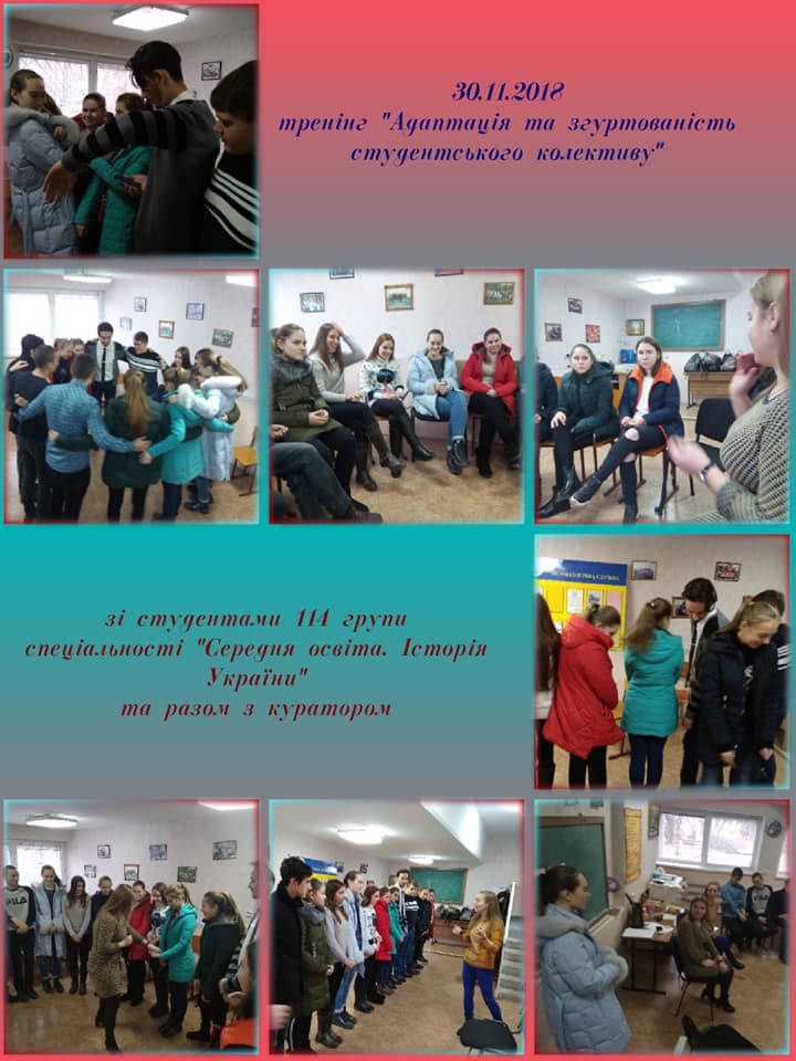 Впродовж листопада місяця 2018 року зі студентами-першокурсниками в рамках психологічної служби університету відбулися цикли тренінгових занять на тему «Адаптація та згуртованість студентів-першокурсників» для студентів 164 та 174 групи спеціальності “Політологія” та “Історія та археологія” історичного факультету, зі студентами 197 групи спеціальності “Соціальна робота” факультету педагогіки та психології , ля студентів 128 групи спеціальності “Дошкільна освіта” факультету дошкільної та початкової освіти та зі студентами 114 групи спеціальності “Середня освіта. Історія України” історичного факультету разом з їх куратором.
