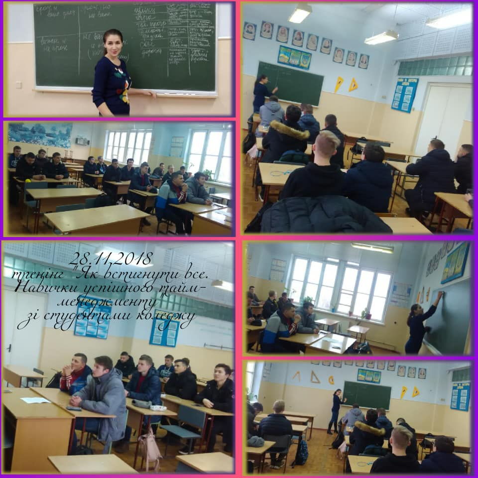 28 листопада 2018 року було проведено тренінгове заняття на тему “Як встигнути все. Навички успішного тайм-менеджменту” для студентів коледжу університету груп 355, комп’ютерна інженерія, 265 прикладна матиматика, і 335 фінанси, банківська справа та страхування.