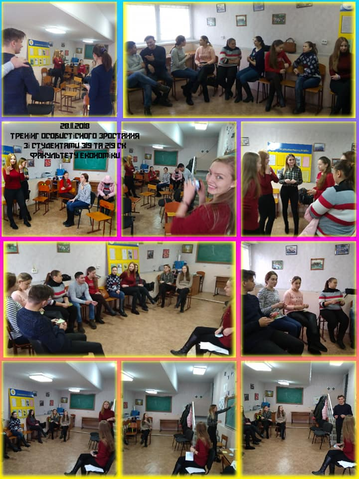 28 листопада 2018 року в рамках психологічної служби університету було проведено тренінгове заняття на тему “Особистісний розвиток – запорука успіху” зі студентами 219СК та 319 групи спеціальності “Обліку та оподаткування” факультету економіки.