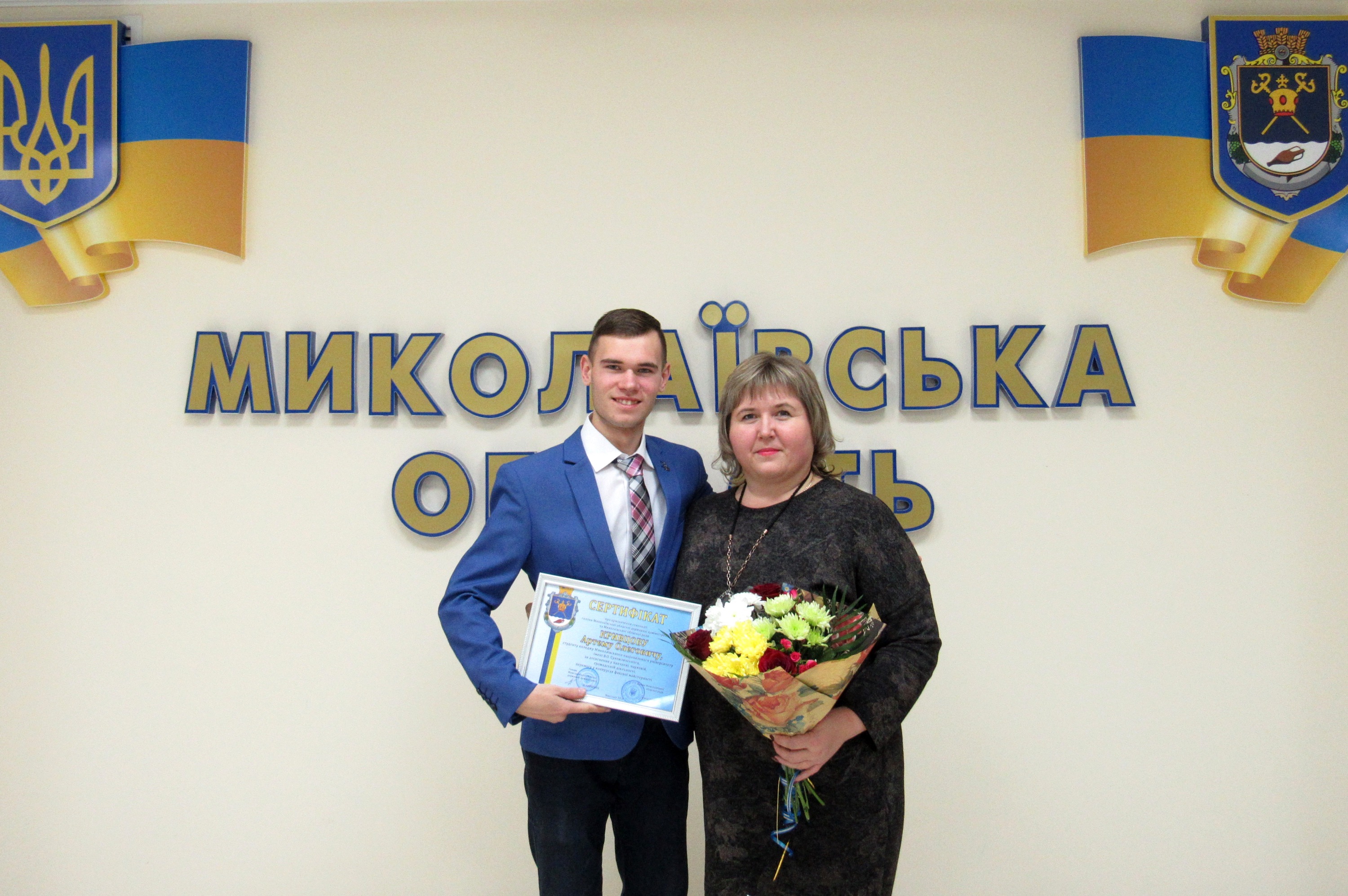 За досягнення у навчанні, науковій, громадській діяльності, перемогу у конкурсах фахової майстерності сертифікатом на призначення стипендії губернатора нагороджено КРИВЦОВА АРТЕМА ОЛЕГОВИЧА, студента ІІІ курсу спеціальності «Право» Коледжу Миколаївського національного університету імені В.О. Сухомлинського.