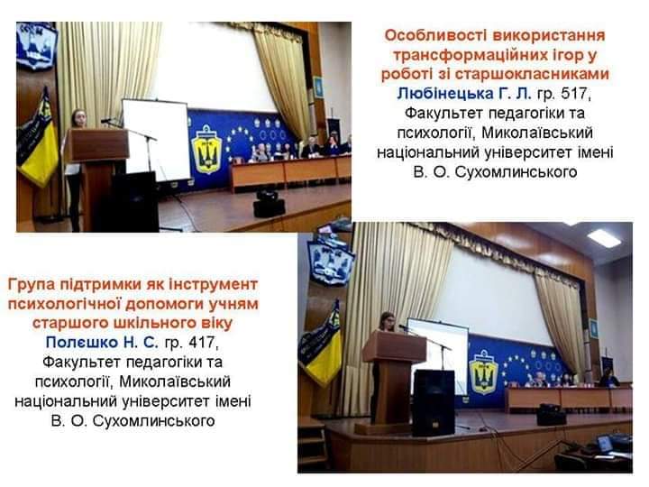 7 грудня 2018 р. консультант психологічної служби університету Любінецька Г. та студентка Полєшко Н. (417 гр.), взяли активну участь у роботі Всеукраїнської науково-практичної конференції «Проблеми соціально-гуманітарних наук», що проходила на базі Національного університету кораблебудування імені адмірала Макарова.