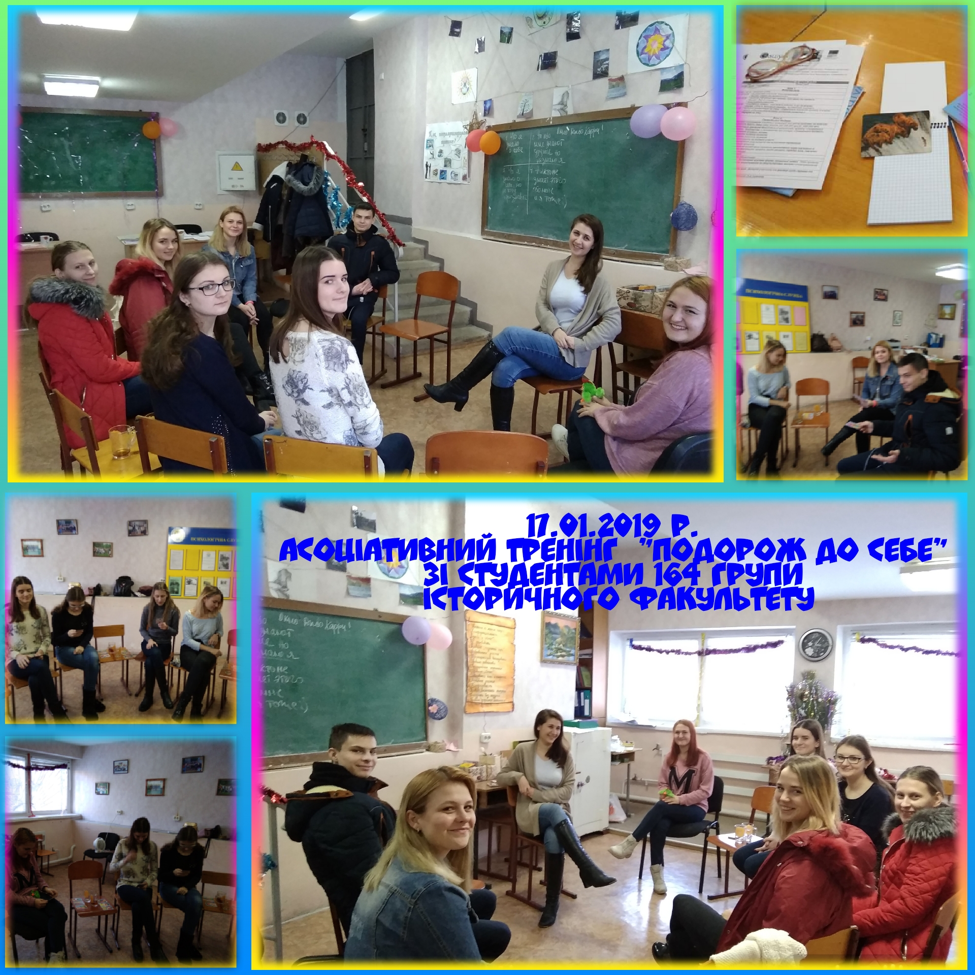 17 січня 2019 року для студентів 164 групи історичного факультету був проведений тренінг “Подорож до себе”, який допомагає краще зрозуміти себе та інших людей.