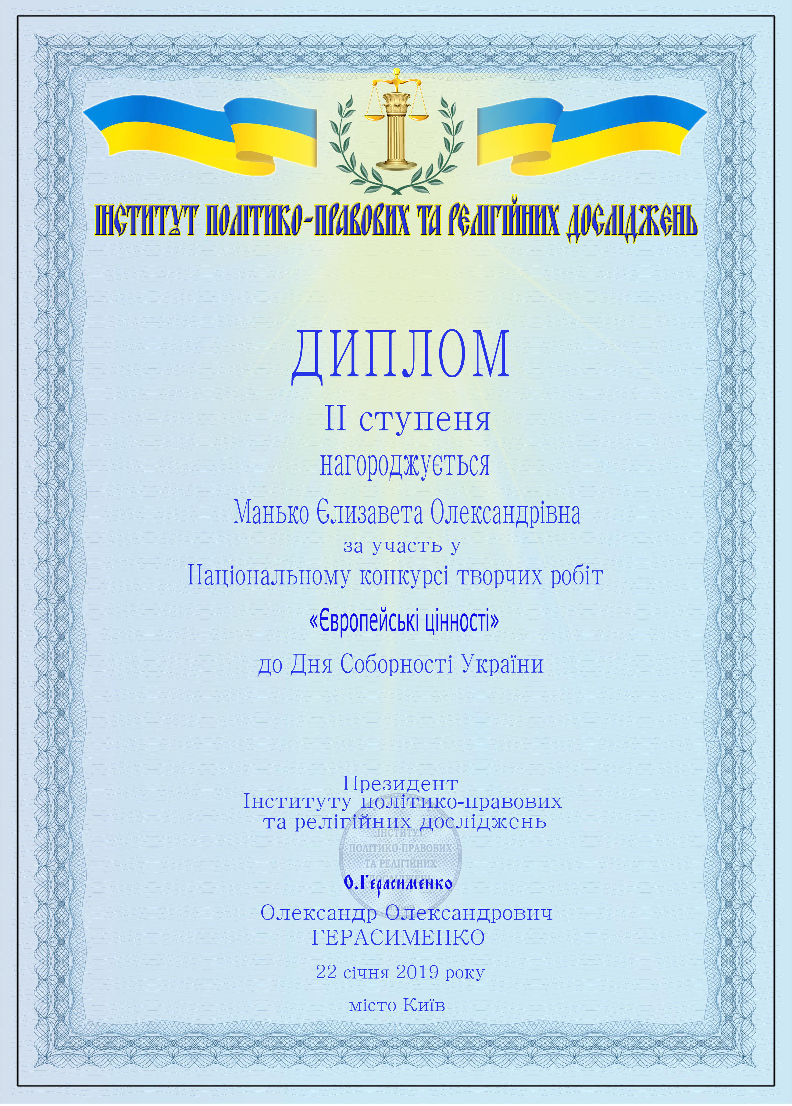 Інститутом політико-правових та релігійних досліджень проведено Національний конкурс творчих робіт (есе) «Європейські цінності» до Дня Соборності України.