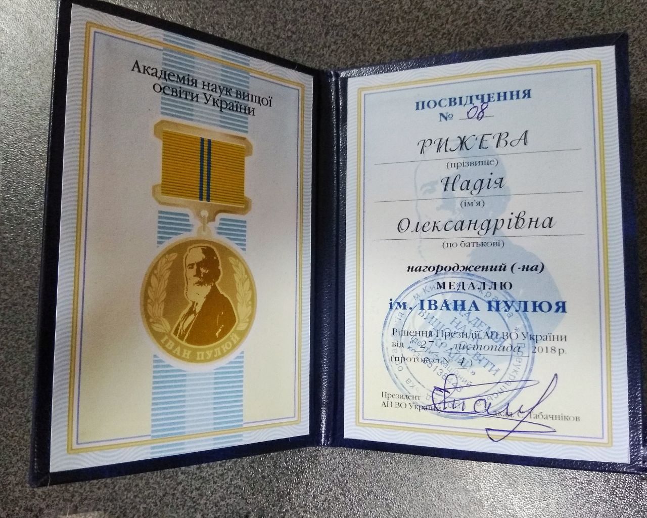 29 січня 2019 року в МНУ імені В.О. Сухомлинського на засіданні вченої ради ректор університету, академік НАПН України Валерій Дмитрович Будак, вручив медаль ім. Івана Пулюя Надії Олександрівні Рижевій, доктору історичних наук, професору, завідувачу кафедри історії та археології, якою вона була нагороджена Академією наук вищої освіти України.