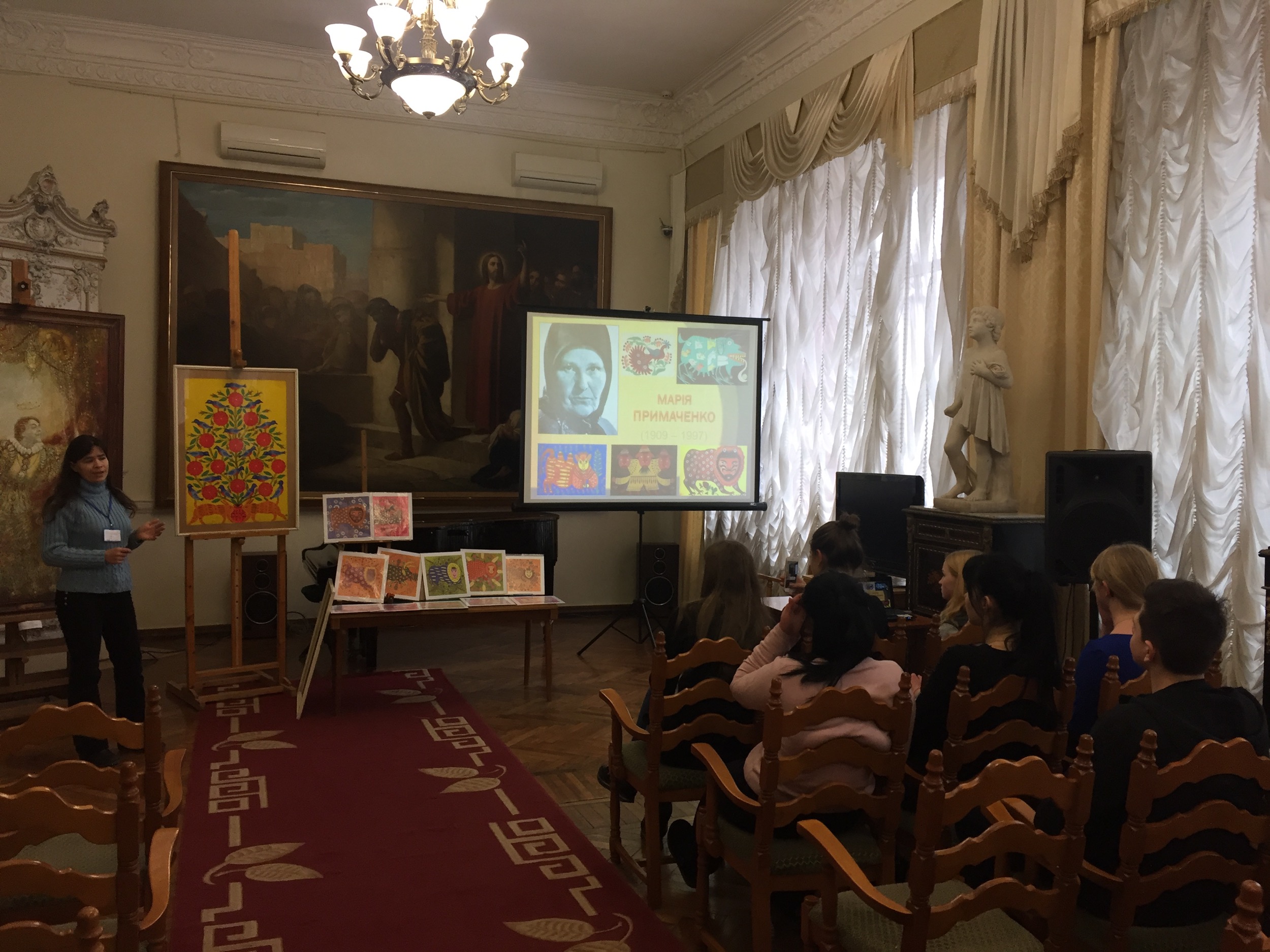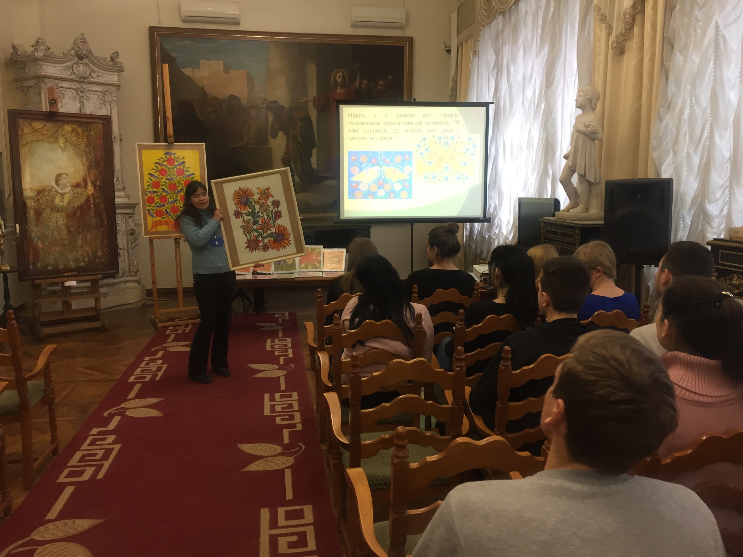 Студенти ознайомились із власним мистецьким стилем художниці та мали можливість побачити характерні риси її стилю та особливості поліського народного декоративного розпису, в межах якого нескінченні варіанти декоративних, орнаментальних, жанрових і пейзажних композицій, що вплітаються в естетично-філософське трактування стосунків людини та Всесвіту. Оригінальну авторську картину «Гуляють солов’ї навесні», створену майстринею у 1988 році, доповнюють роботи її послідовників та графічні репродукції, що зберігаються у фондах музею.