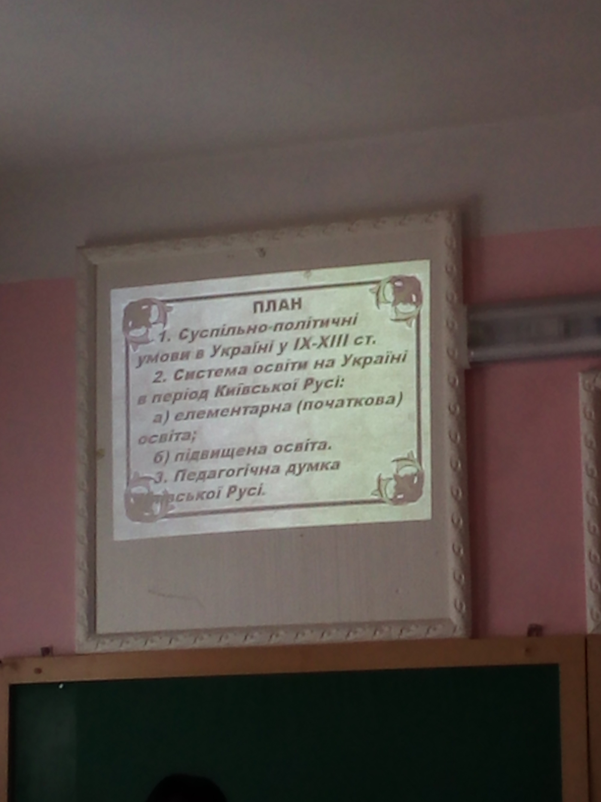Мета лекції – познайомити студентів 1 курсу спеціальності «Початкова освіта» із суспільно-політичними умовами, що склалися в Україні у ІХ-ХІІІ ст. і як вони вплинули на становлення і розвиток системи виховання і освіти в даний період; з’ясувати особливості розвитку національної системи освіти у у ІХ-ХІІІ ст.. Викладач виховувала у студентів почуття гордості за український народ, відчуття етнічної приналежності, український менталітет та патріотичні почуття.