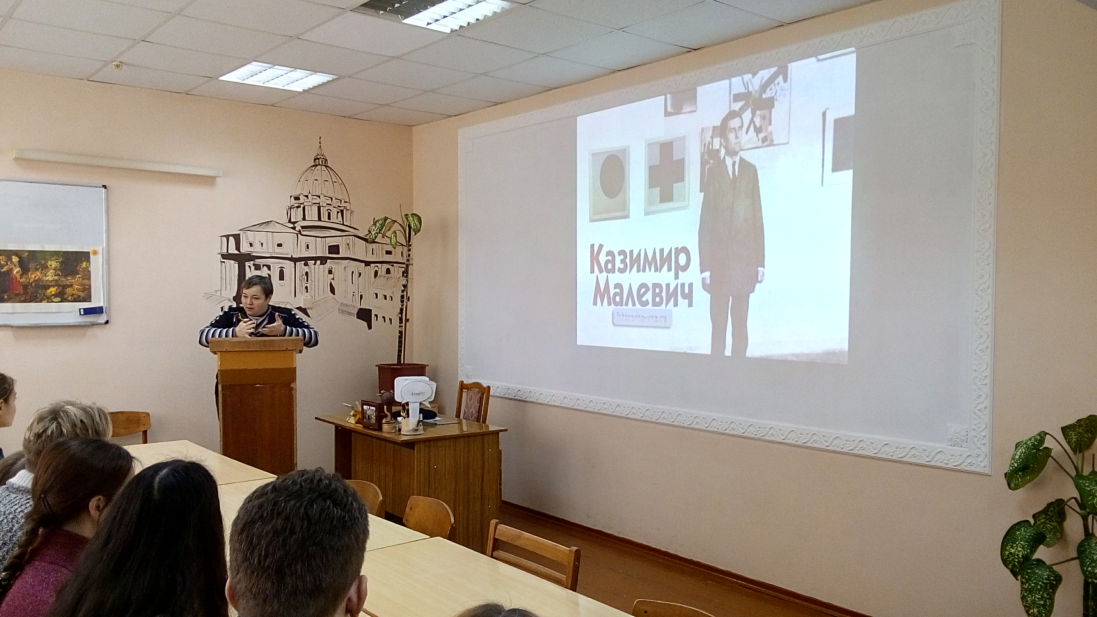 Студенти кафедри музичного мистецтва та соціальної роботи познайомилися із драматичним життєвим та творчим шляхом Малевича, намагалися розкрити зміст таємничого «Чорного квадрату», зрозуміти сутність супрематизму через осягнення творів, та долучилися до всеукраїнської прем’єри «Малевич. Український квадрат» – документального фільму, показ якого відбувся 23.02.2019 в Українському Домі в Києві.