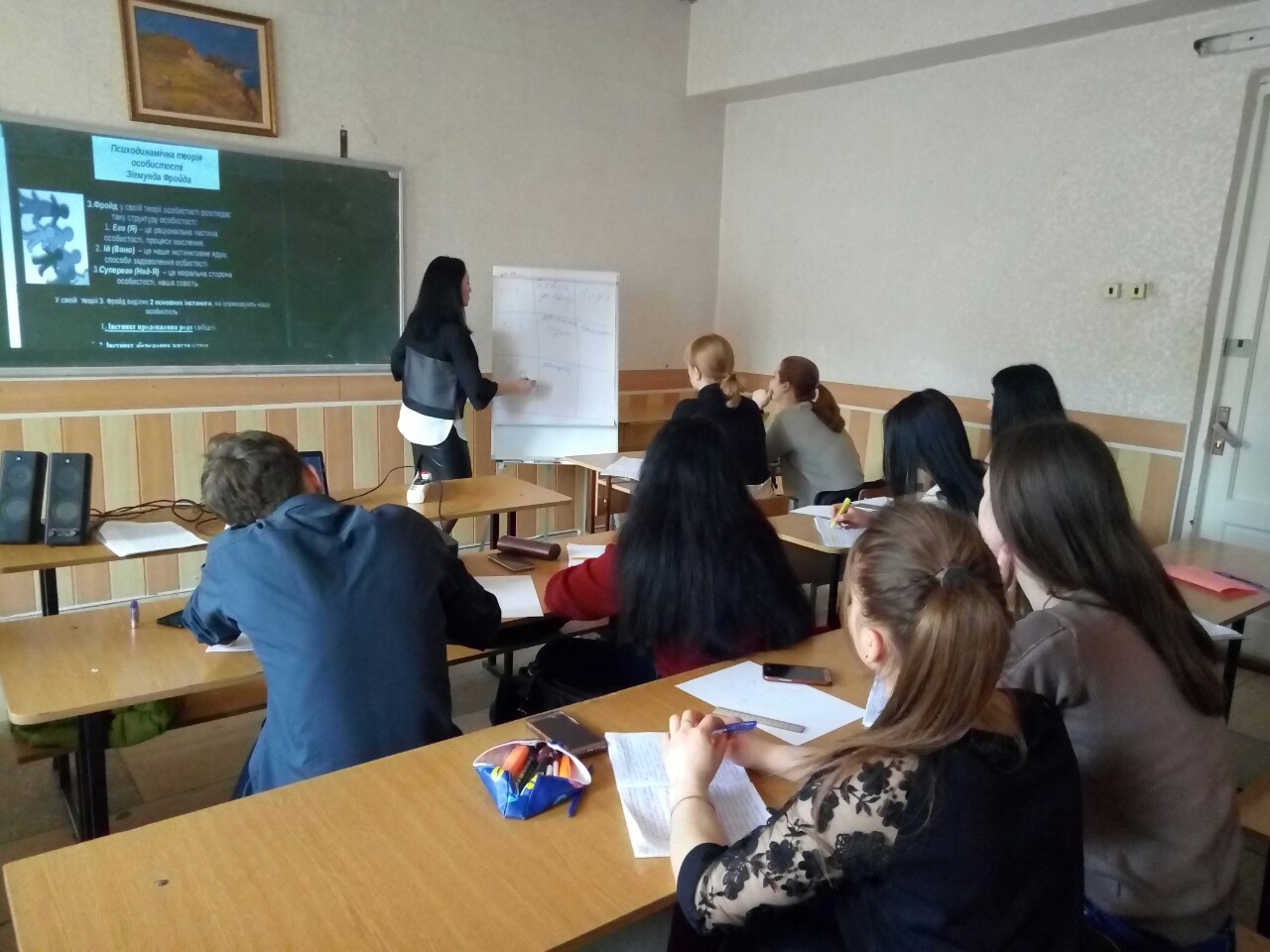 25 березня доцент кафедри педагогіки та інклюзивної освіти О.В. Дрозд провела відкриту лекцію з дисципліни «Психологія» для студентів 201 групи кафедри української мови та літератури на тему: «Особистість. Теорії особистості».