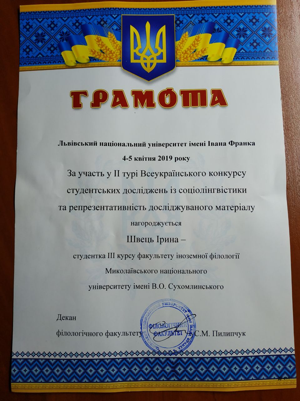 Лінгвісти факультету іноземної філології у перший тиждень квітня представляли МНУ на конкурсах молодих науковців! 5 квітня студентки спеціальності “Прикладна лінгвістика” підкорювали своїми знаннями ВНЗ Львова. Швець Ірина, студентка 3 курсу, виступила із доповіддю у Львівському національному університеті імені І. Я. Франка, взявши участь у ІІ етапі Всеукраїнського конкурсу студентських досліджень із соціолінгвістики. Савчук Любов, студентка 4 курсу, продемонструвала свої знання на Всеукраїнській студентській олімпіаді зі спеціальності “Прикладна лінгвістика” у Національному університеті “Львівська політехніка”, отримавши диплом-відзнаку за використання інформаційних технологій. Дівчата на власному прикладі продемонстрували високий рівень підготовки та всебічний розвиток прикладної лінгвістики на Миколаївщині.