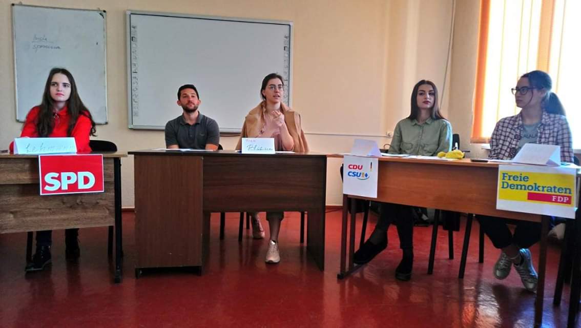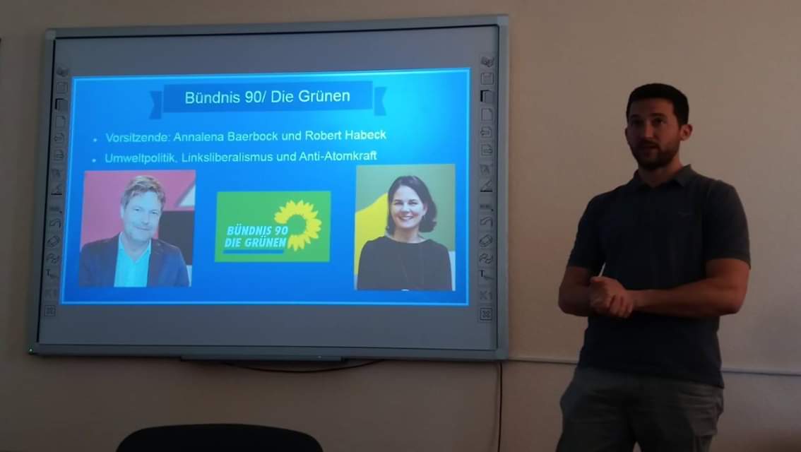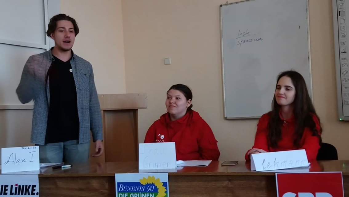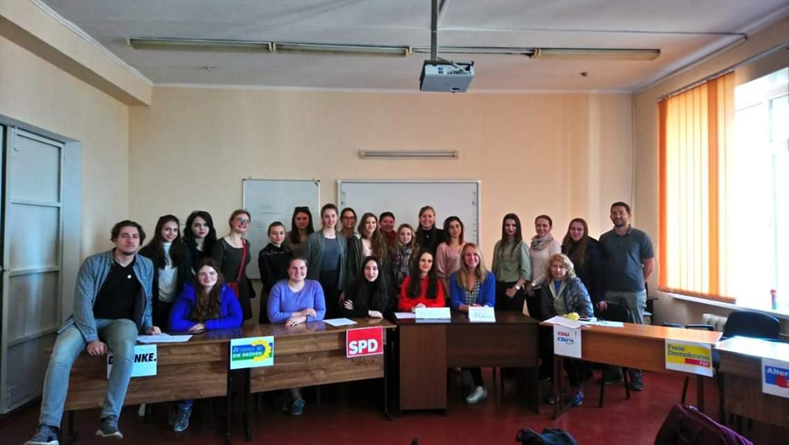 Продуктивність, креатив, різносторонність – саме під таким гаслом пройшла п’ятниця для студентів кафедри германської філології та перекладу. У рамках краєзнавчого проекту «Mit Deutsch auf Tour» («Подорож з німецькою») за підтримки Гете Інституту в Україні 5 квітня 2019 року до факультету іноземної філології завітали мовні асистенти з Німеччини Heinrich Ammon (Генріх Аммон) und Jana Dall (Яна Далл), які провели для студентів воркшоп «Politische Parteien in Deutschland» («Політичні партії Німеччини»). Студенти спеціальності «Німецька мова та література» отримали змогу проявити себе у інтерактивній грі та спробувати власні сили у ролі представників найвідоміших німецьких партій. Воркшоп був спрямований на ознайомлення зі специфікою поглядів партії із середини, її головні особливості та напрямки роботи. Працюючи у командах, студенти факультету іноземної філології отримали можливість проникнути у серце німецького політичного життя, а також покращити свої мовні знання, спілкуючись німецькою мовою.