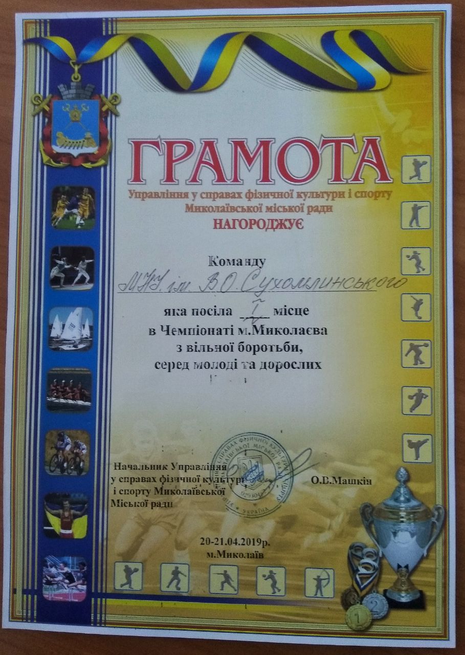 Студенти факультету фізичної культури та спорту уже вкотре демонструють усім свою майстерність та займають призові місця. Так, 20 – 21 квітня 2019 року команда «МНУ імені В.О.Сухомлинського» посіла I місце в Чемпіонаті м. Миколаєва з вільної боротьби серед молоді та дорослих.