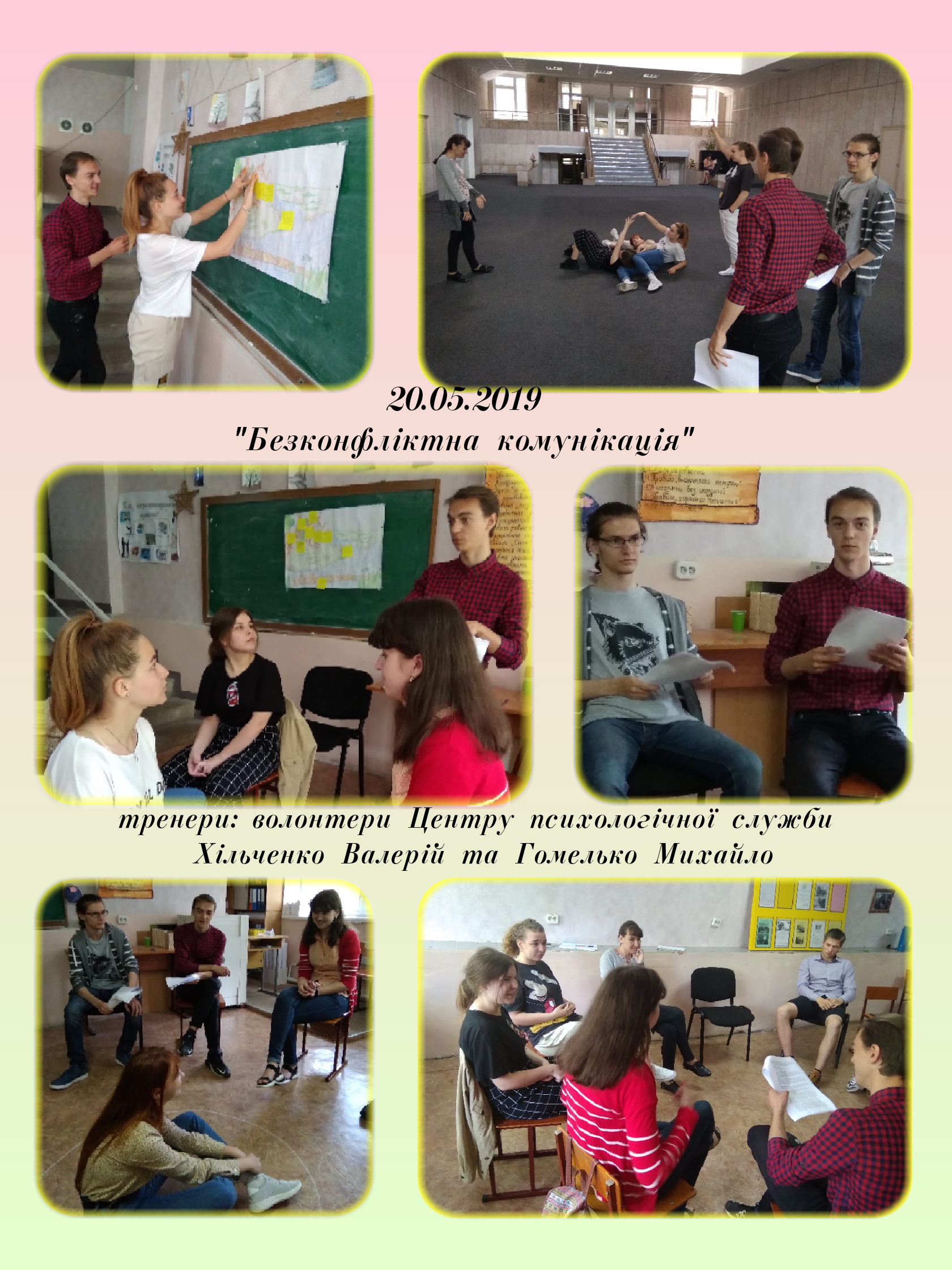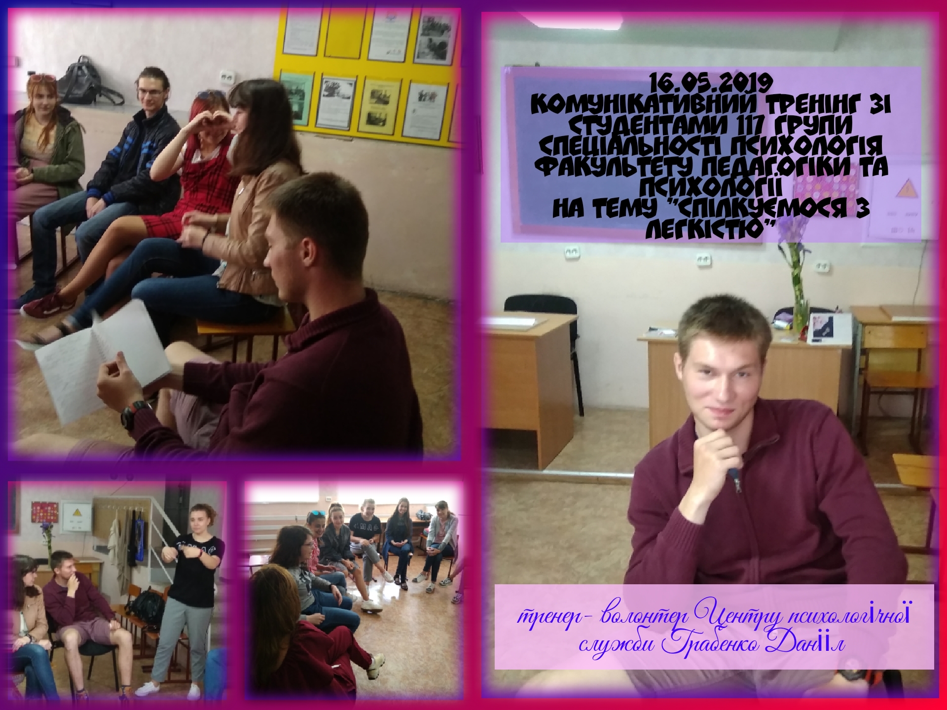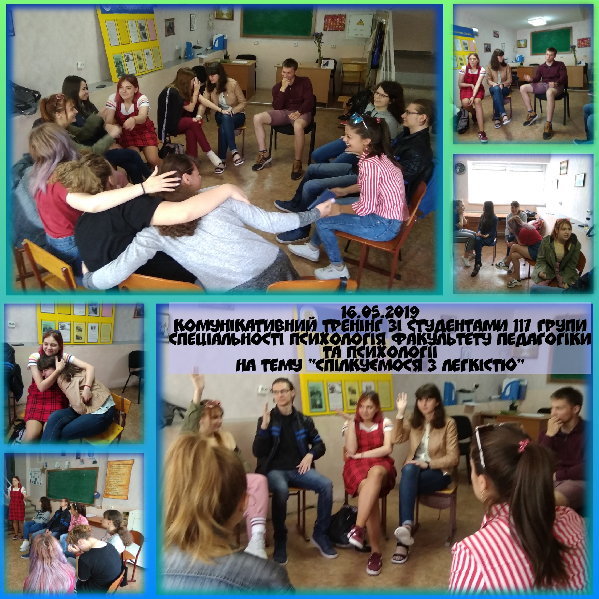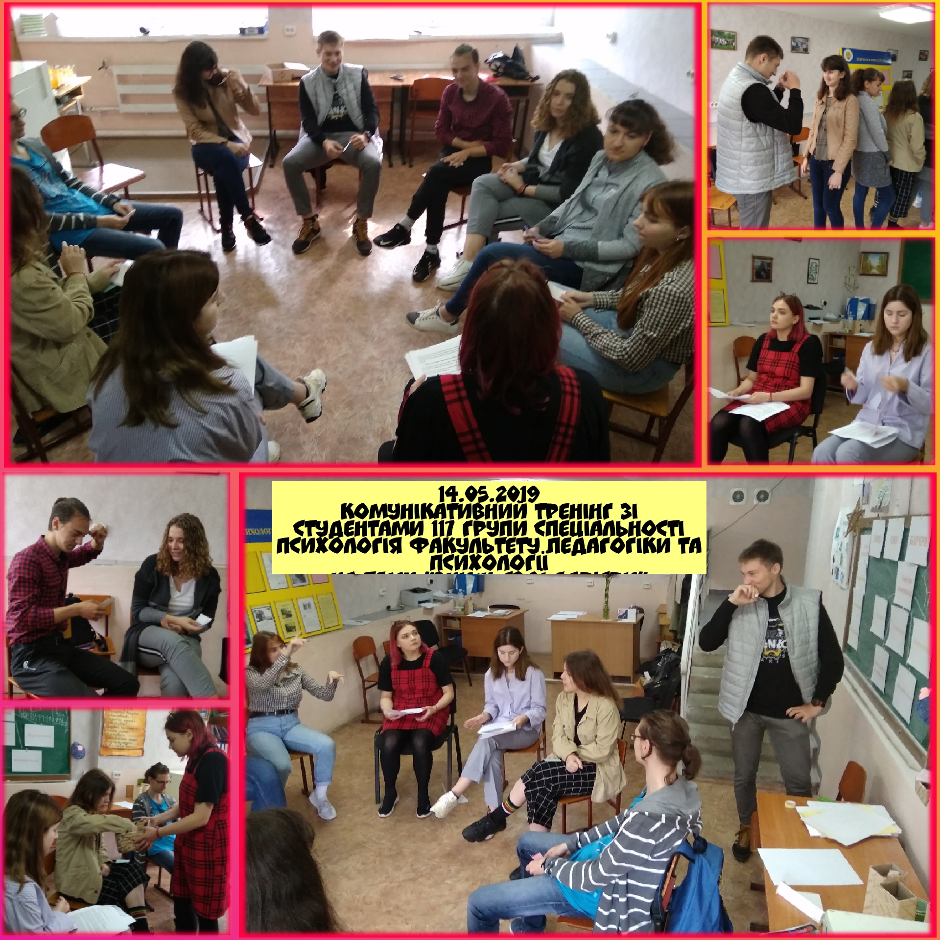 14, 16 та 20 травня 2019 року в рамках Центру психологічної служби університету був проведений комунікативний тренінг для студентів 117 групи спеціальності Психологія факультету педагогіки та психології.