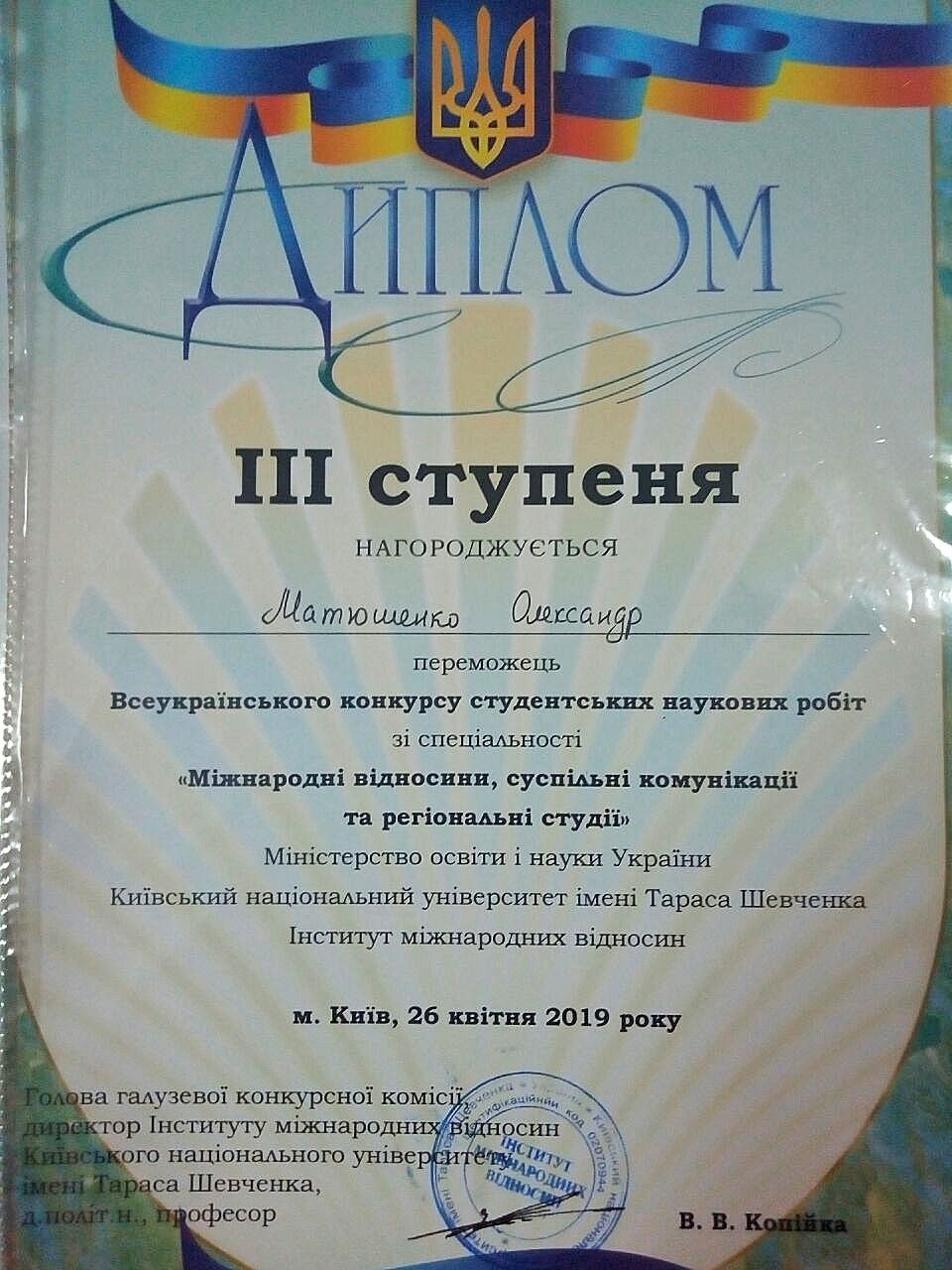 Матюшенко Олександр 26 квітня 2019 року став переможцем Всеукраїнського конкурсу студентських наукових робіт зі спеціальності «Міжнародні відносини, суспільні комунікації та регіональні студії» та отримав диплом III ступеня.
