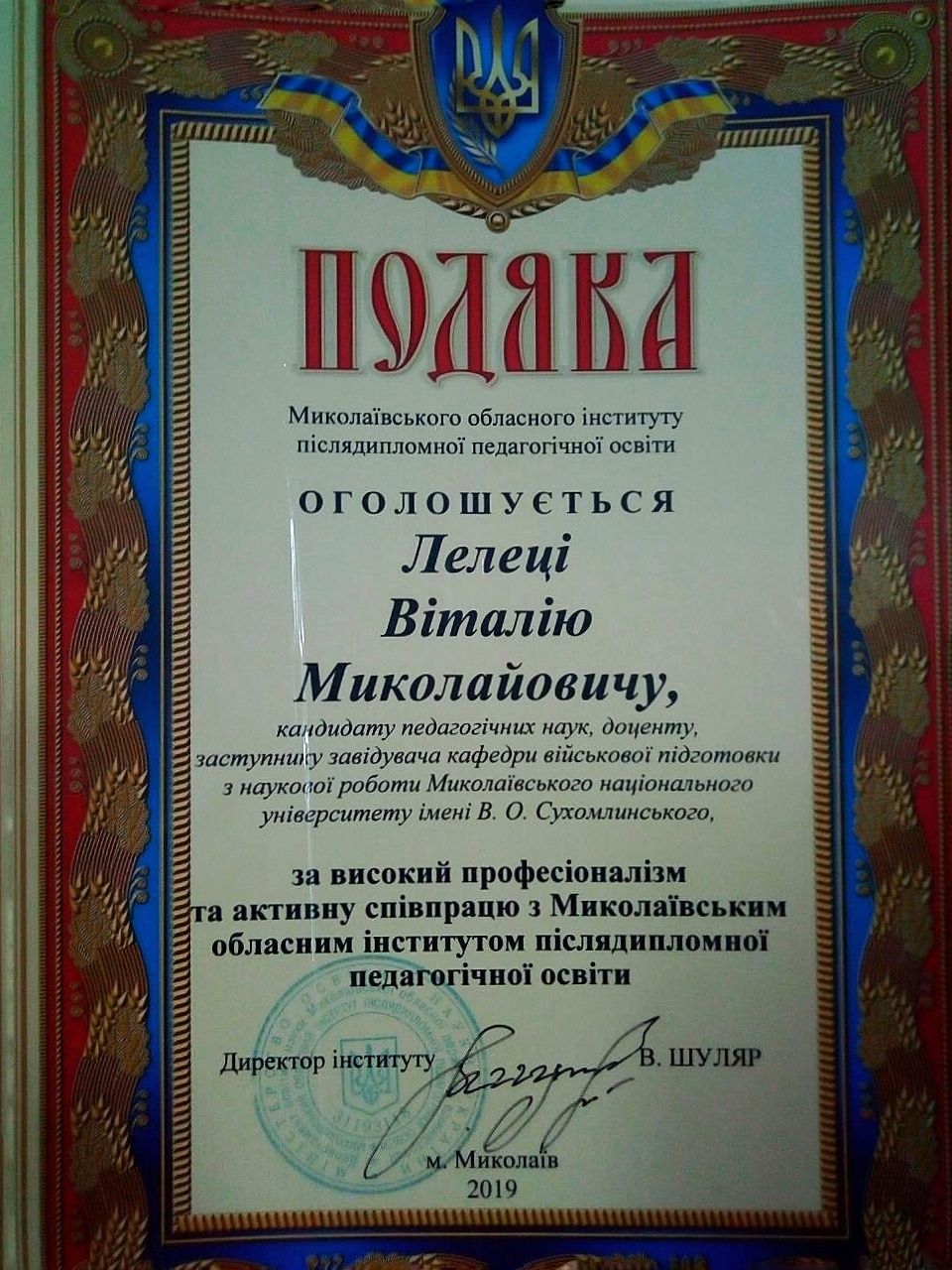 Подякою Миколаївського обласного інституту післядипломної педагогічної освіти був нагороджений Лелека Віталій Миколайович, кандидат педагогічних наук, доцент, заступник завідувача кафедри військової підготовки з наукової роботи Миколаївського національного університету імені В.О.Сухомлинського, за високий професіоналізм та активну співпрацю з Миколаївським обласним інститутом післядипломної педагогічної освіти.