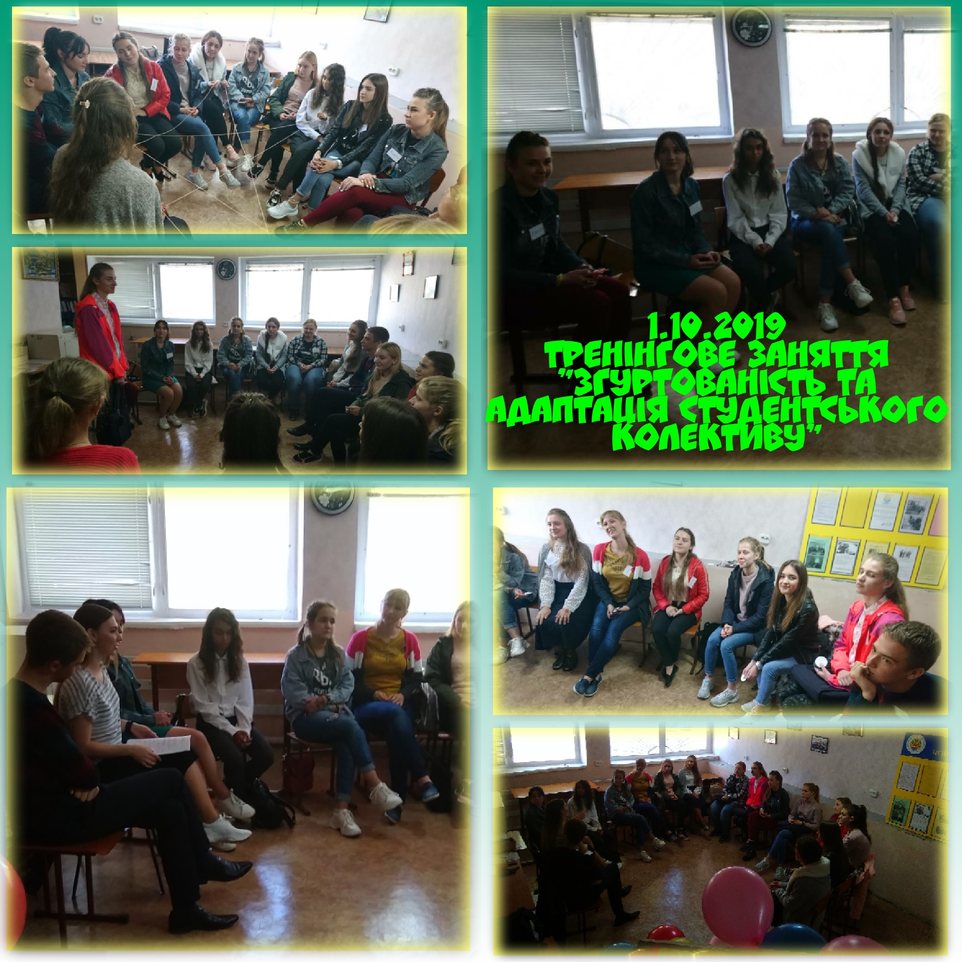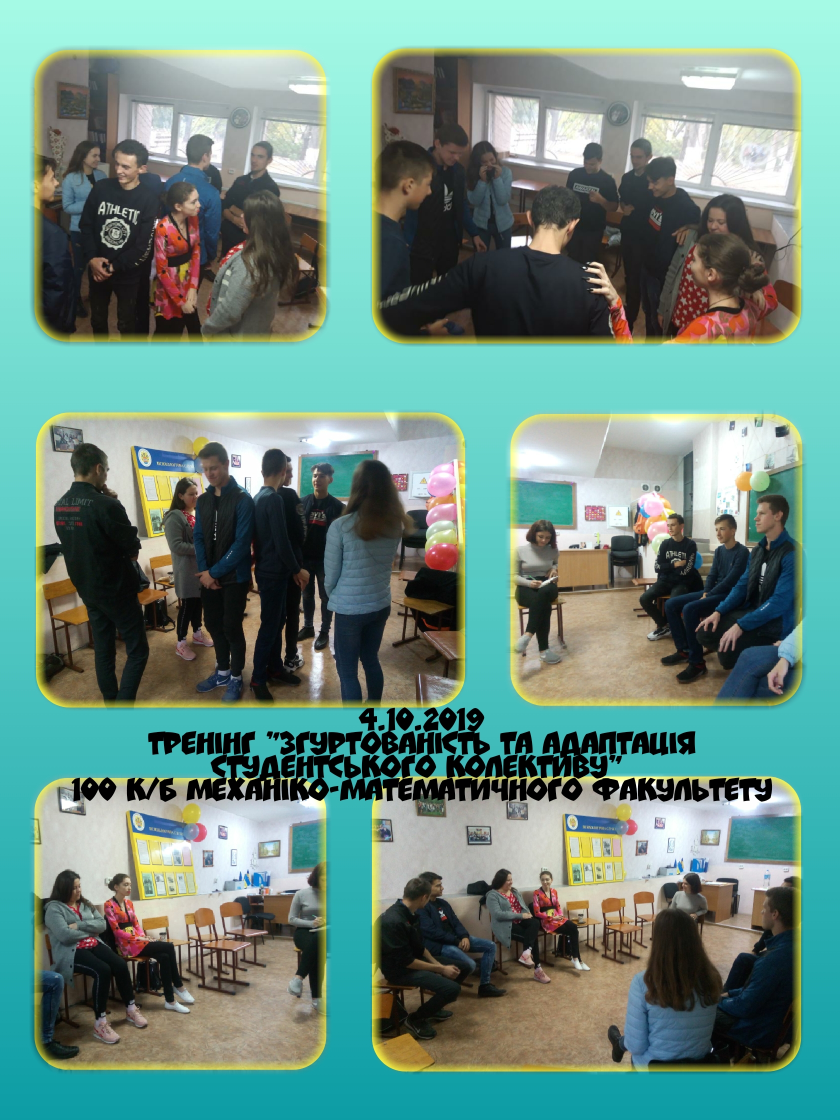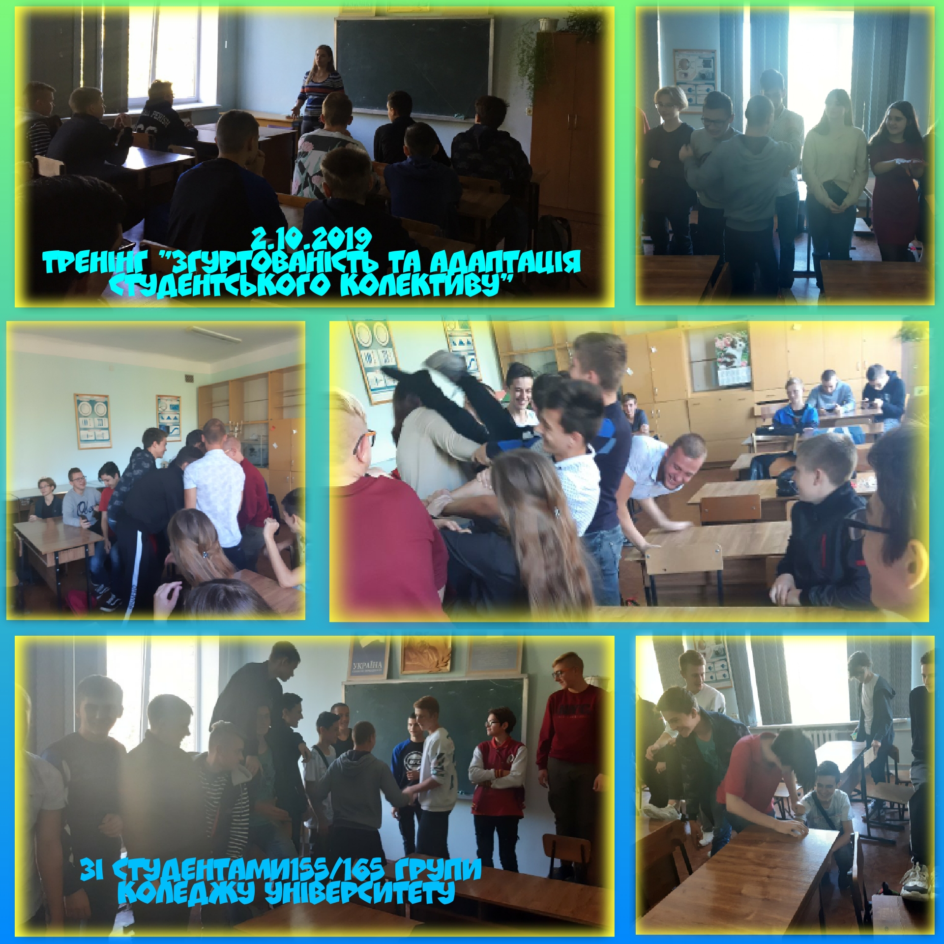 З 1.10. по 4.10.2019 року в рамках Центру психологічної служби університету були проведені тренінгові заняття з теми “Згуртованість та адаптація студентського колективу” зі студентами 1 курсу 107 К/Б факультету педагогіки та психології, 125, 135, 155, 165 груп Коледжу МНУ імені В.О. Сухомлинського, 100 К/Б механіко-математичного факультету.