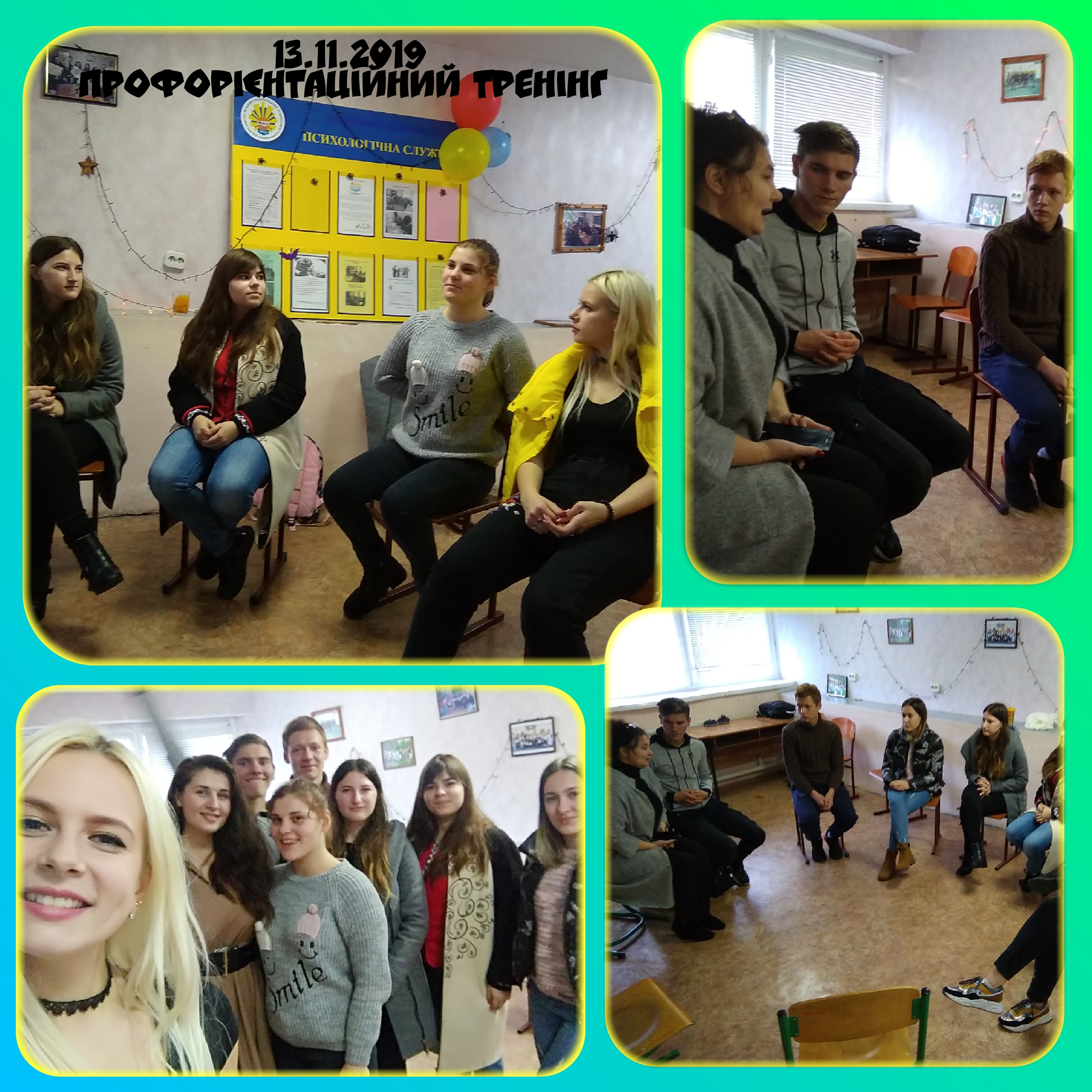 Маючи на меті ознайомлення з особливостями професійного самовизначення учасників, заняття змогли розширити для студентів значення та умови правильного вибору професії, визначити професійну спрямованість для кожного учня за допомогою проведених самими профорієнтологами практиних вправ.