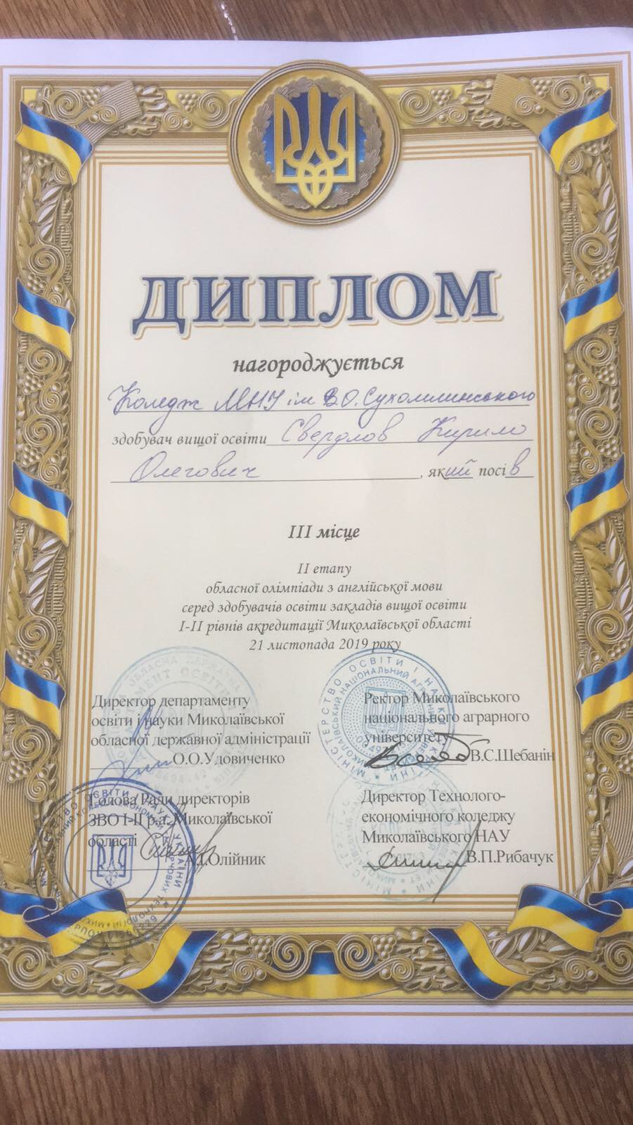 Вітаємо переможця ІІ етапу обласної олімпіади з англійської мови СВЕРДЛОВА КИРИЛА, студента ІІІ курсу, спеціальності 081 «Право», Коледжу Миколаївського національного університету імені В. О. Сухомлинського, який посів ІІІ місце серед здобувачів освіти закладів вищої освіти І-ІІ рівнів акредитації Миколаївської області. Викладач коледжу – Ляшко Анастасія Анатоліївна.