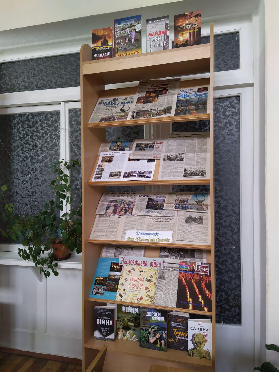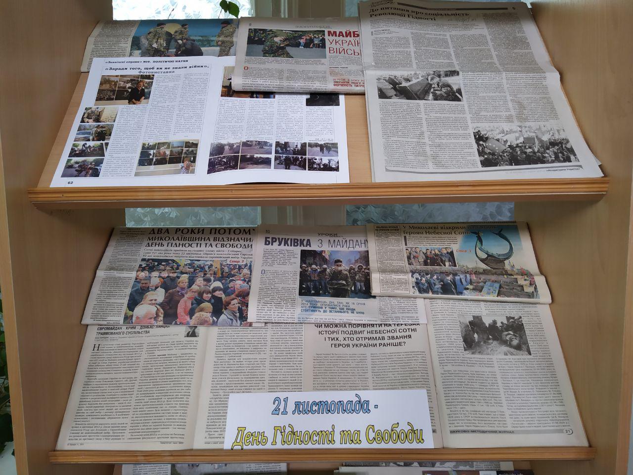 Видання, представлені в даній експозиції, розповідають про героїв і перебіг Революції Гідності, що пробудила в душі кожного українця нестримний потяг до свободи та волі. Саме на Майдані народилася нова українська нація: високоідейна, готова відстоювати ідеали справедливості, правдивості та патріотизму.