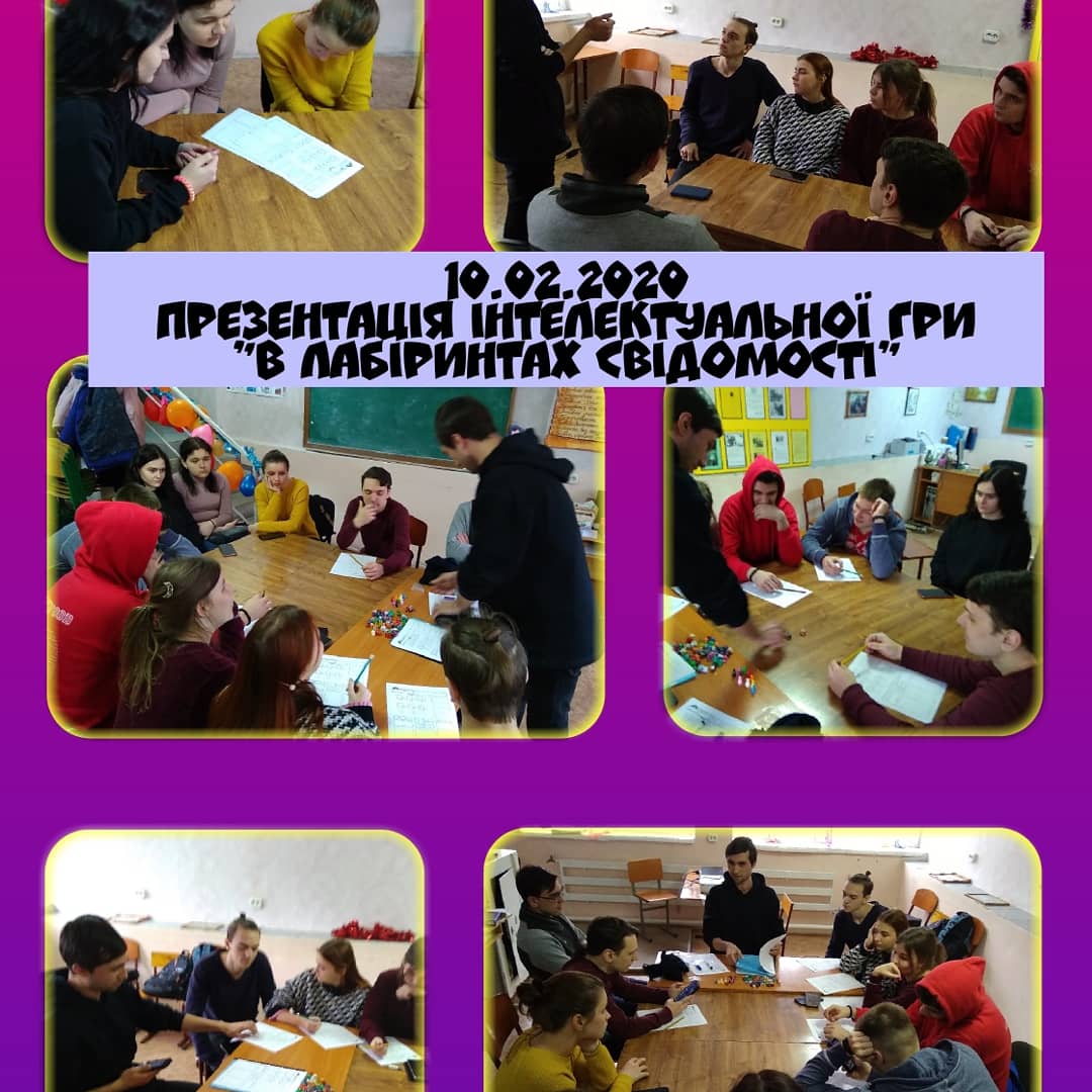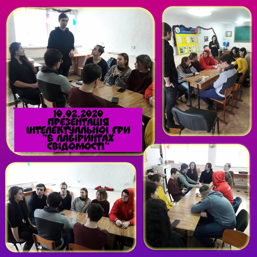 10 лютого 2020 року в рамках Центру психологічної служби університету було проведено презентацію інтелектуальної гри “У лабіринтах свідомості” для студентів 2-3 курсів факультету педагогіки та психології спеціальностей “Психологія”, “Соціальна робота” та “Політологія”.