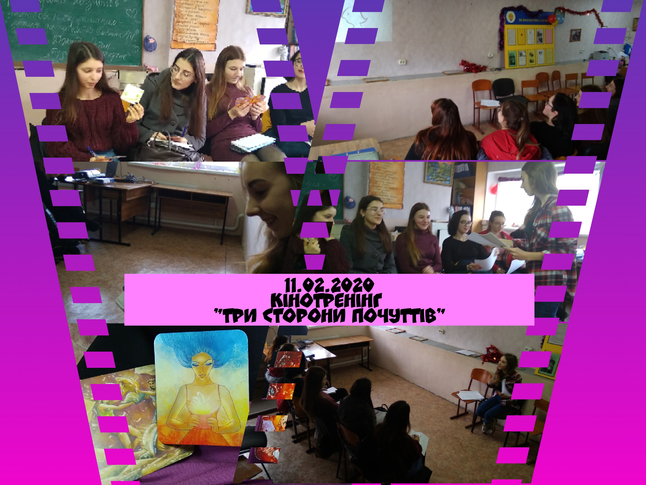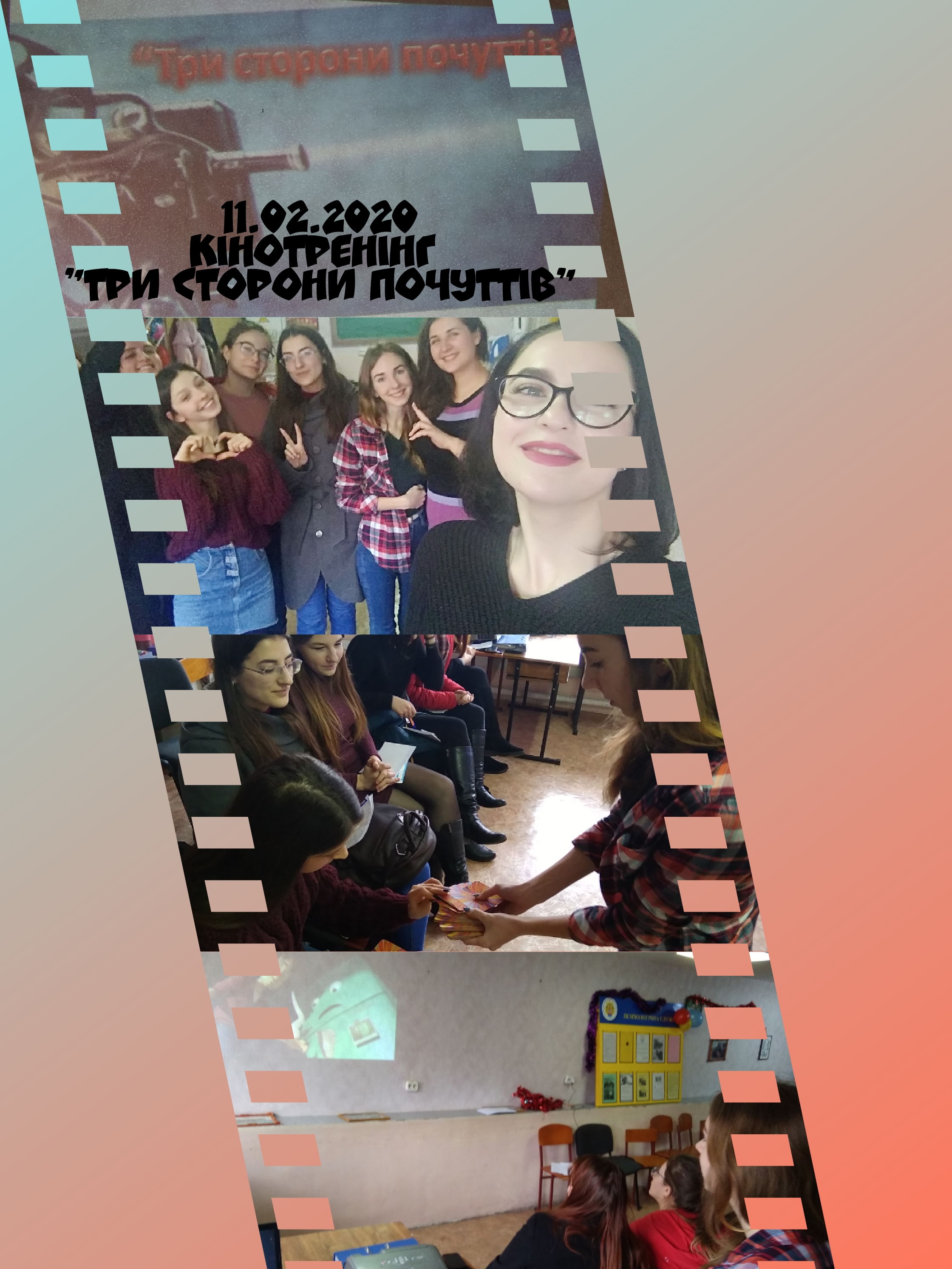 11 лютого 2020 року в рамках Центру психологічної служби університету був проведений кінотренінг на тему “Три сторони почуттів” для студентів 167 групи спеціальності “Логопедія” та 157 групи спеціальності”Музичне мистецтво” факультету педагогіки та психології.