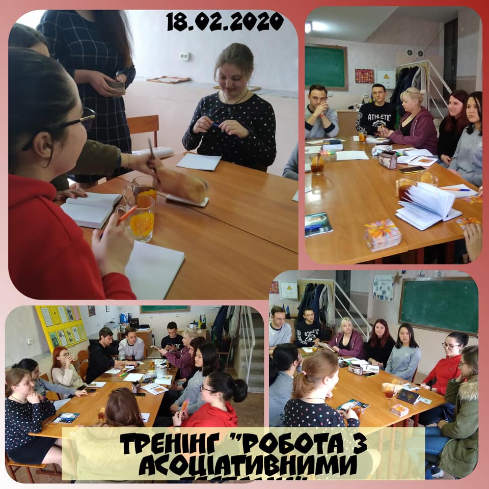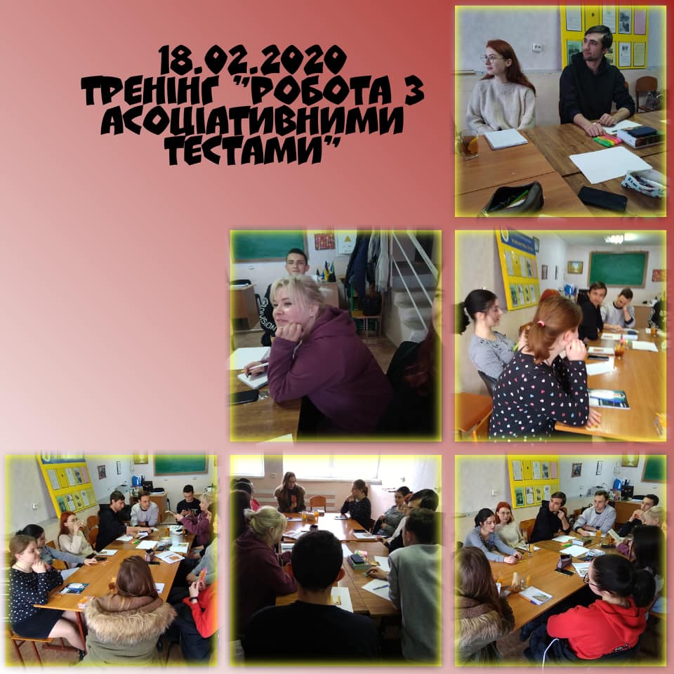 18 лютого 2020 року в рамках Центру психологічної служби університету було проведений тренінг на тему “Робота з асоціативним тестами” для студентів 100 К групи механіко-математичного факультету, для студентів 118 та 228 групи спеціальностей Дошкільна освіта та Початкова освіта факультету дошкільної та початкової освіти та для студентів 2, 4 курсу спеціальності Психологія факультету педагогіки та психології.