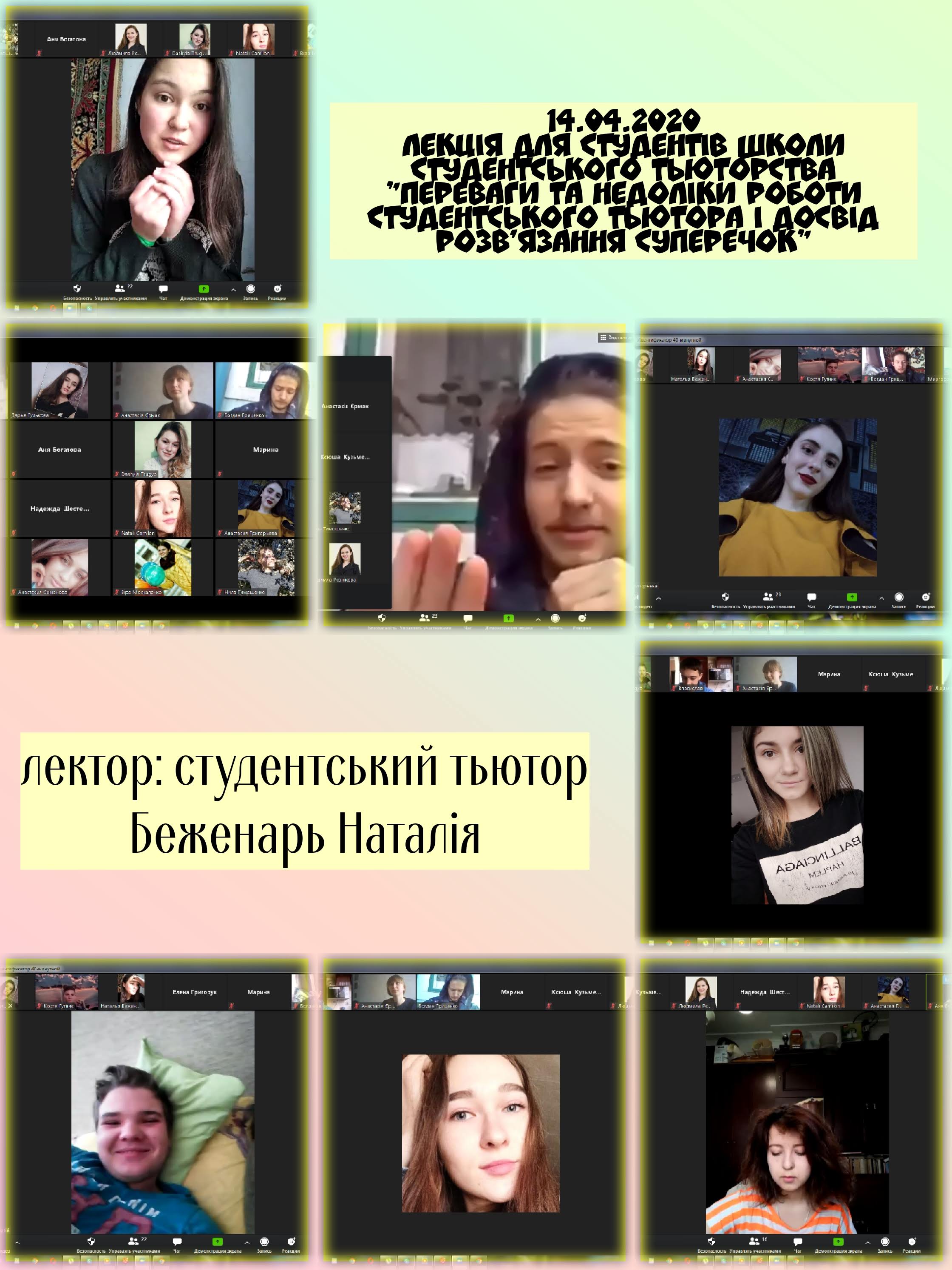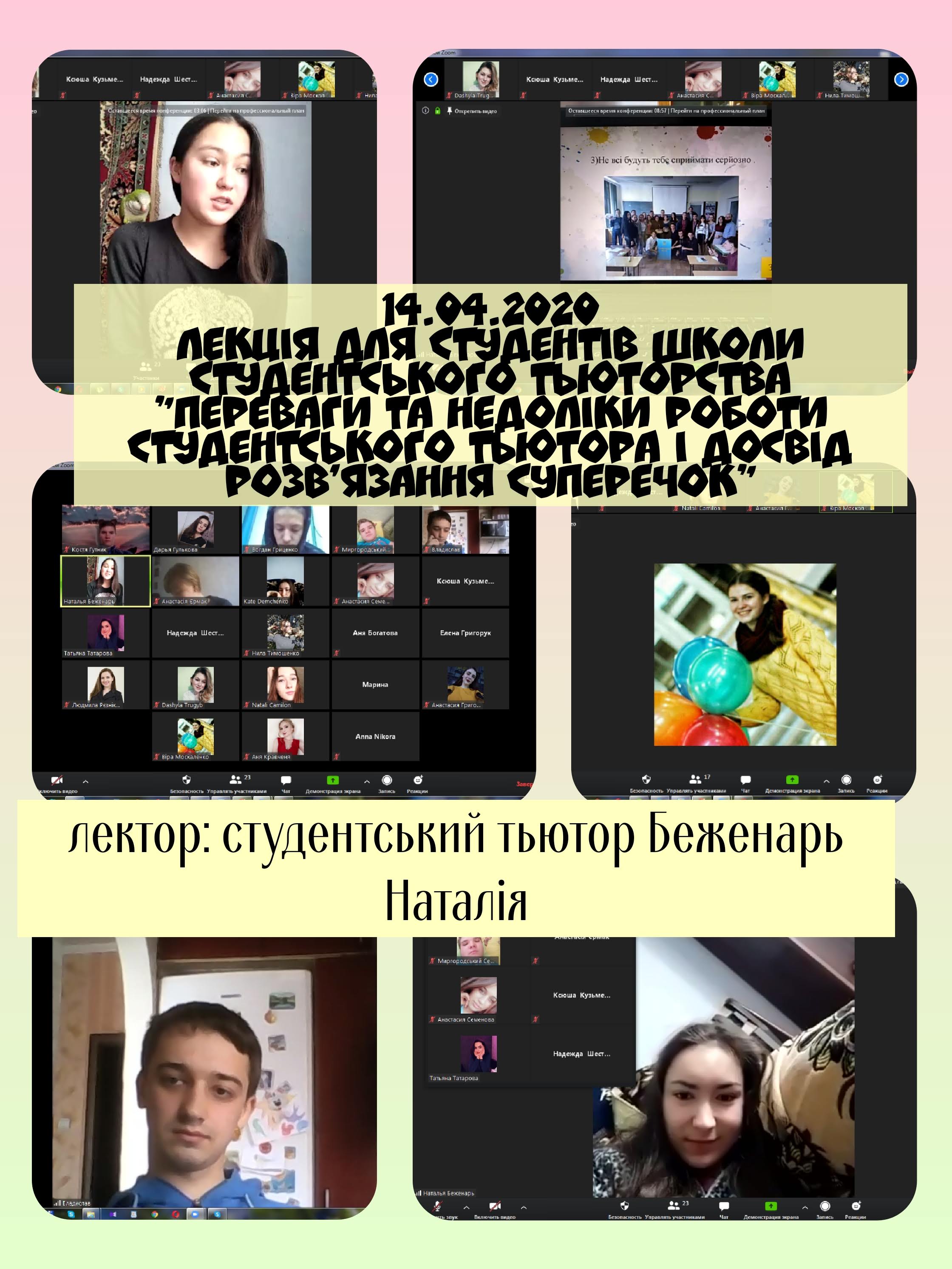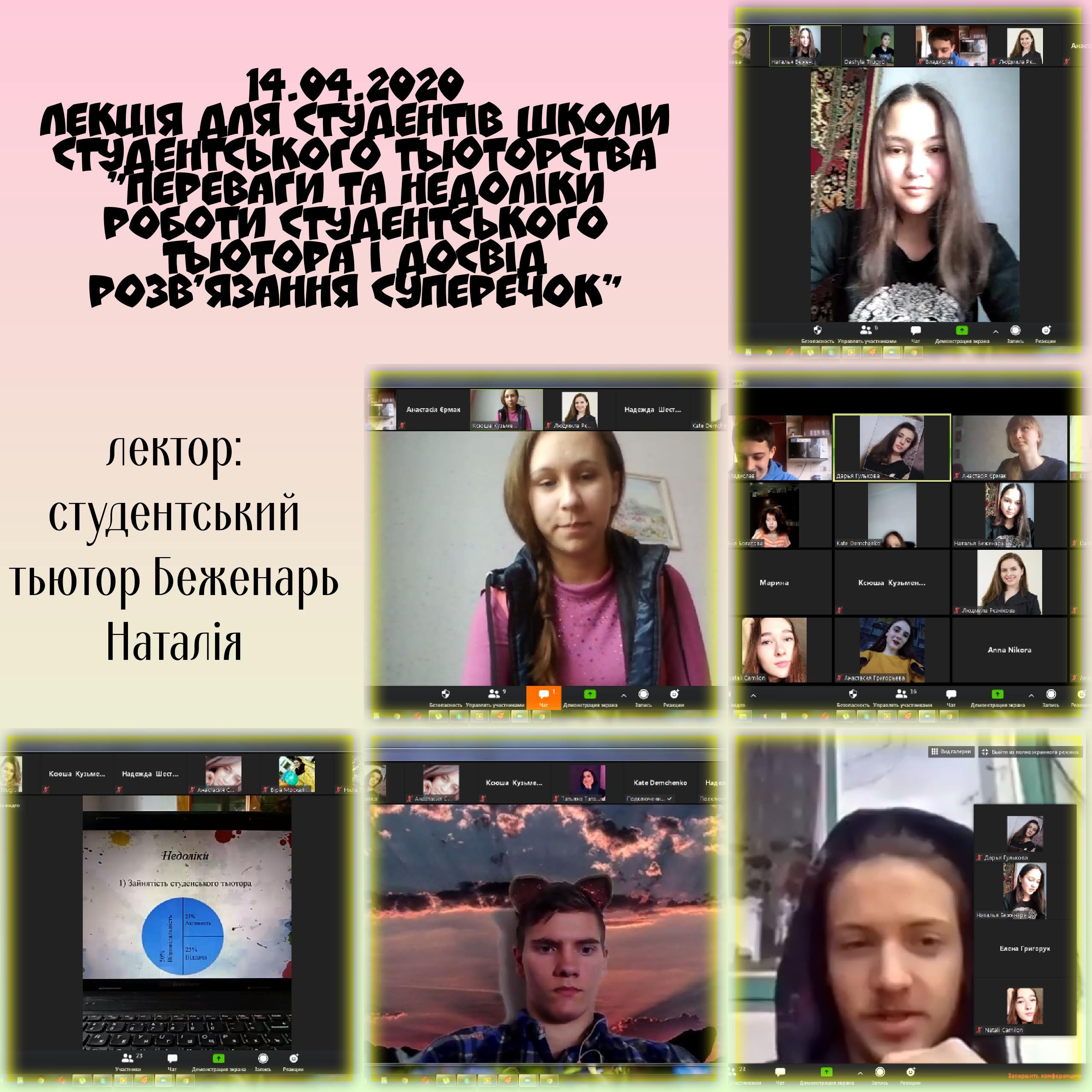 14 квітня 2020 року для студентів Школи студентського тьюторства була проведена лекція в режимі онлайн на тему “Переваги та недоліки роботи студентського тьютора та досвід розв’язання суперечок”.