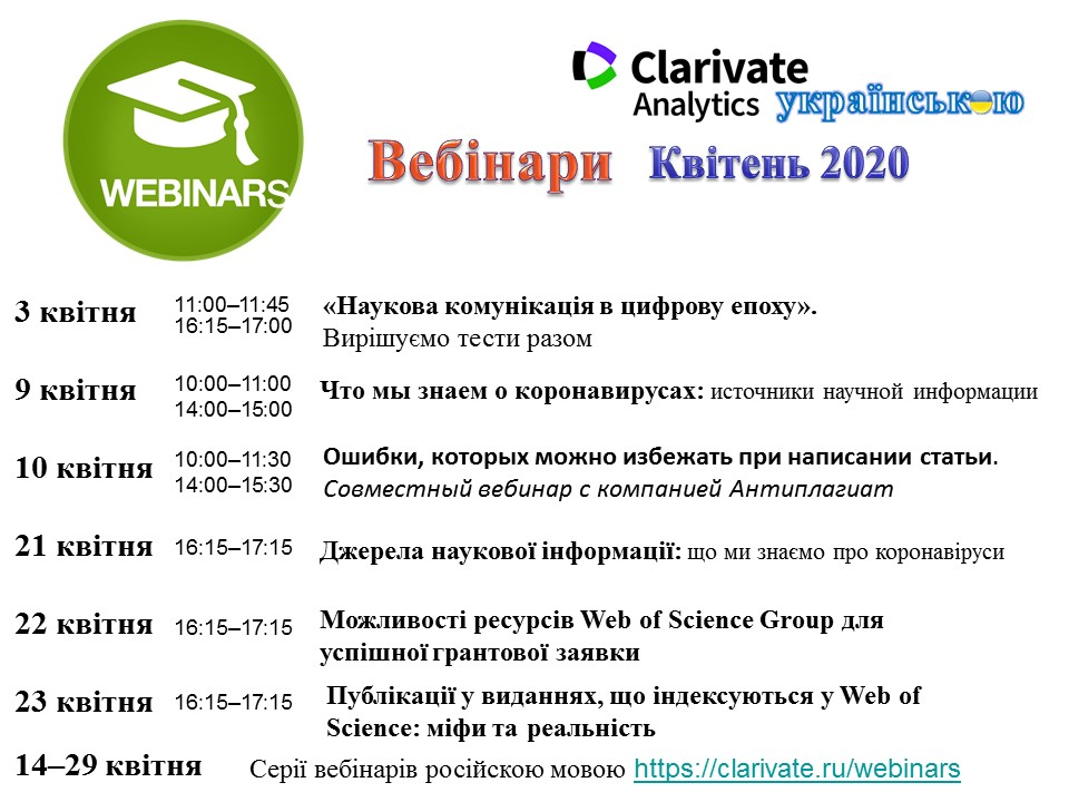 14-29 квітня – три стандартні серії вебінарів російською мовою, розклад на https://clarivate.ru/webinars.