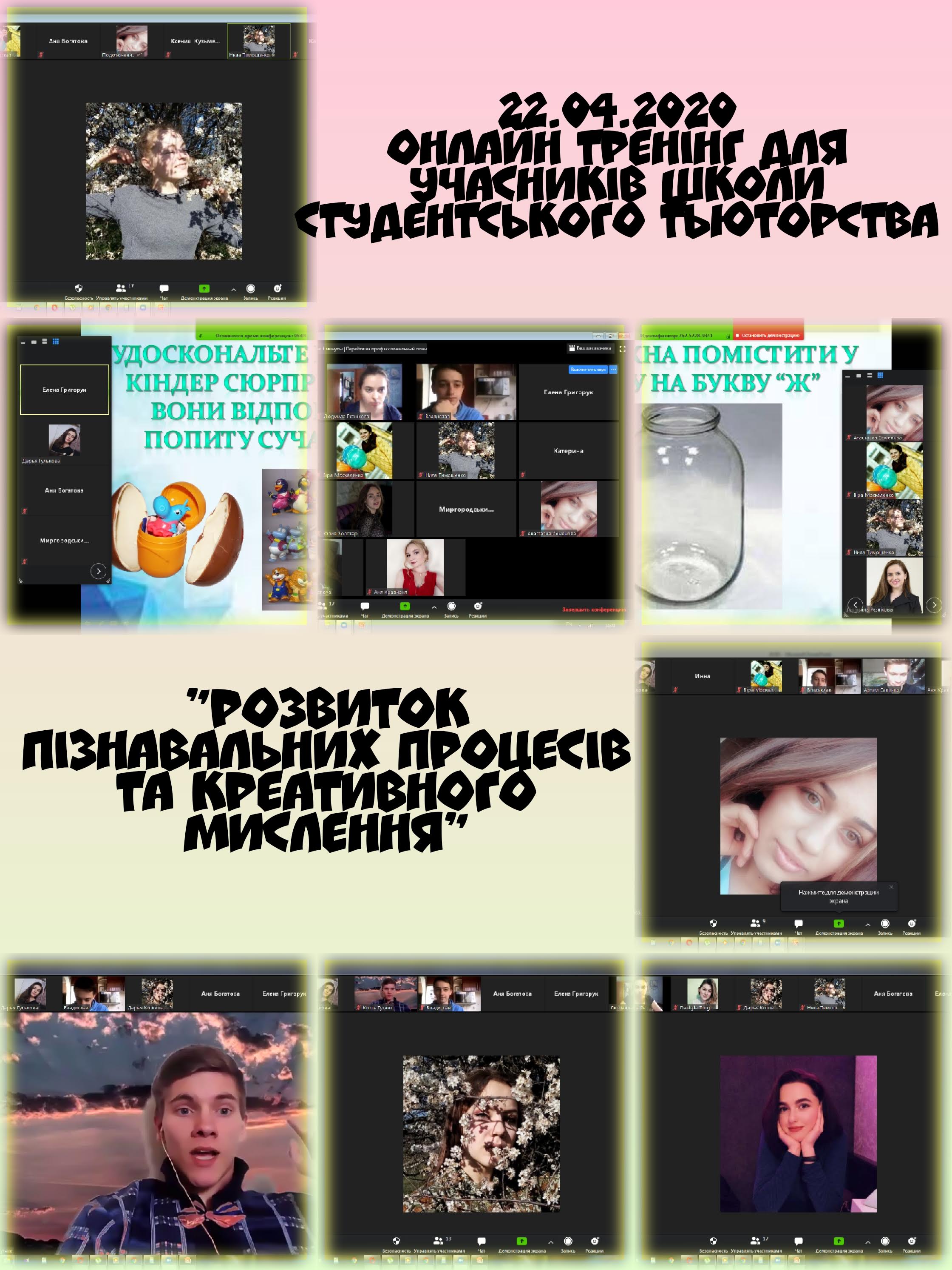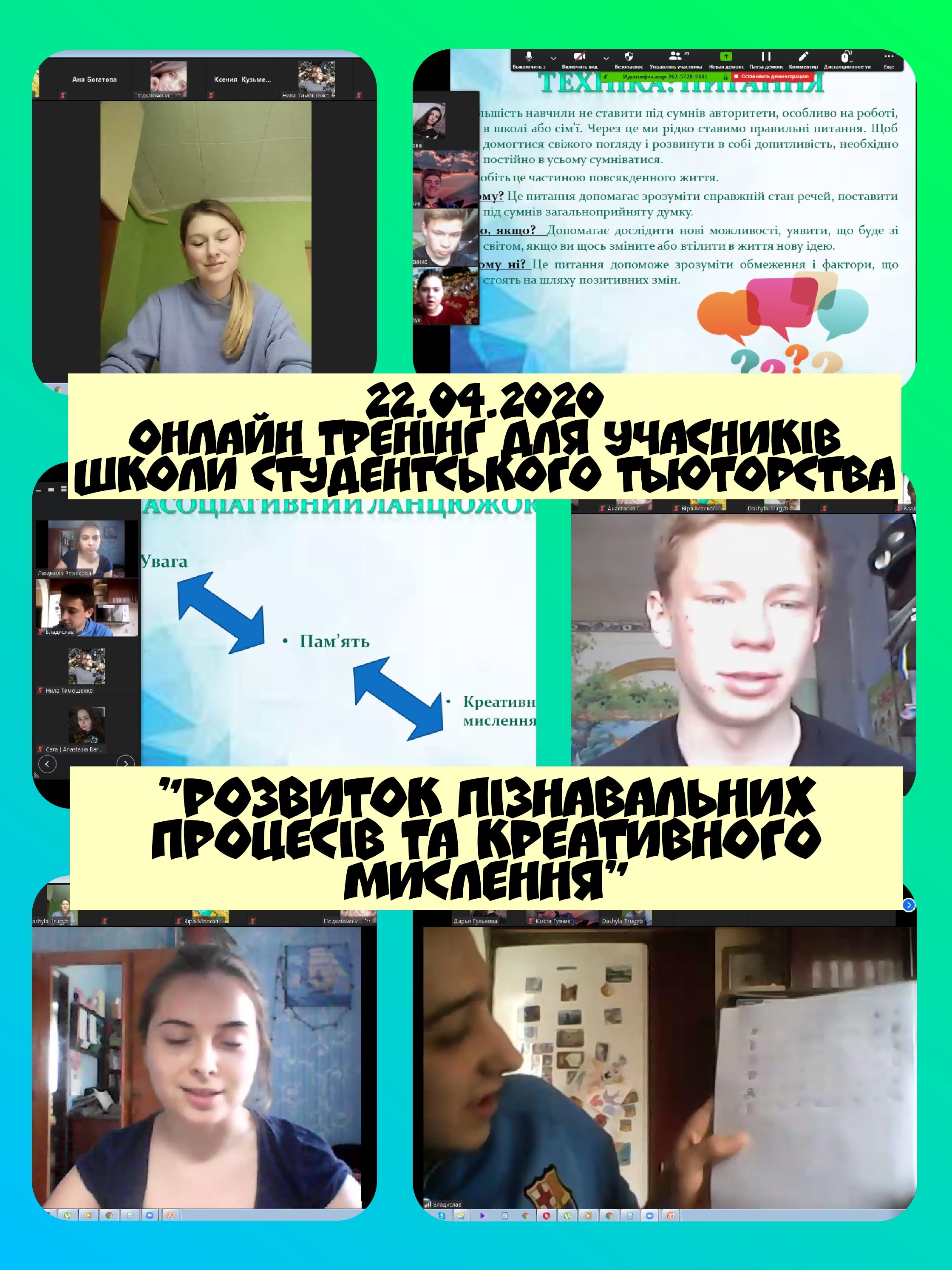 22 квітня 2020 року для учасників Школи студентського тьюторства було проведено тренінгове онлайн-заняття на тему “Розвиток пізнавальних процесів і креативного мислення”.