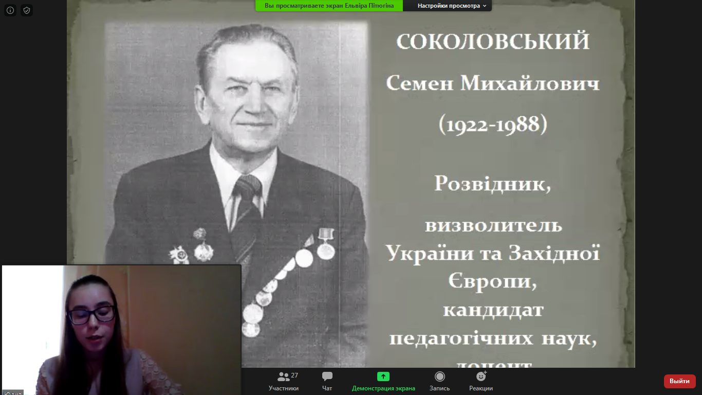 8 травня на факультеті дошкільної та початкової освіти було проведено онлайн-захід, присвячений 75-річчю Перемоги над нацизмом у Другій світовій війні. Студенти першого курсу спеціальностей 012 Дошкільна освіта та 013 Початкова освіта декламували вірші, розповідали про трагічні сторінки Другої світової війни. Окрасою заходу стали пісні у виконанні студенток Богачук Катерини та Поточенко Діани. Все далі відходять у минуле грізні роки Другої світової війни, але пам’ять про подвиги дідів та прадідів, їхню мужність і патріотизм залишаться в нашій пам’яті назавжди. Наш священний обов’язок берегти пам’ять про найстрашнішу війну усіх часів і більше ніколи не дозволити їй увірватися в наше життя.