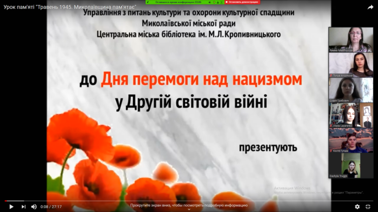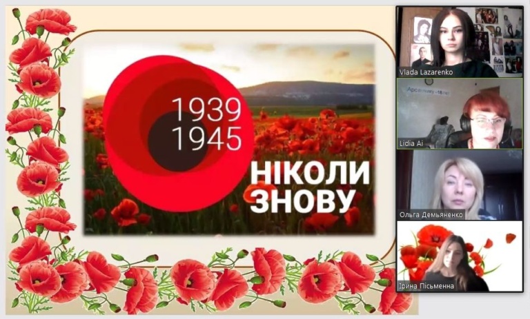 «Never again», «Ніколи знов» – ці фрази в канун Дня пам’яті та примирення стають зрозумілими кожній людині. Он-лайн зустріч, що організована 8 травня 2020 року викладачами кафедри іноземних мов з метою віддати шану українському народові, який відіграв непересічну роль у перемозі у Другій світовій війні, стала ще одним підтвердженням значимості та необхідності у пам’яті про ці події. Під час дистанційного заходу студенти – представники усіх факультетів університету підготували тематичні постери та презентації, натхненно звучали слова віршів у виконанні Влади Лазаренко (239 гр.), Ірини Пісьменної (107 гр.), переглянули кадри з фільму «Травень 1945. Миколаївщина пам’ятає», підготовленого Центральною міською бібліотекою імені М.Л.Кропивницького. Організатори заходу одержали чисельні відгуки від учасників про важливість таких подій для виховання у молоді шанобливого ставлення до історії Батьківщини та тих, хто її творив. Поки живемо, пам’ятаємо!!!