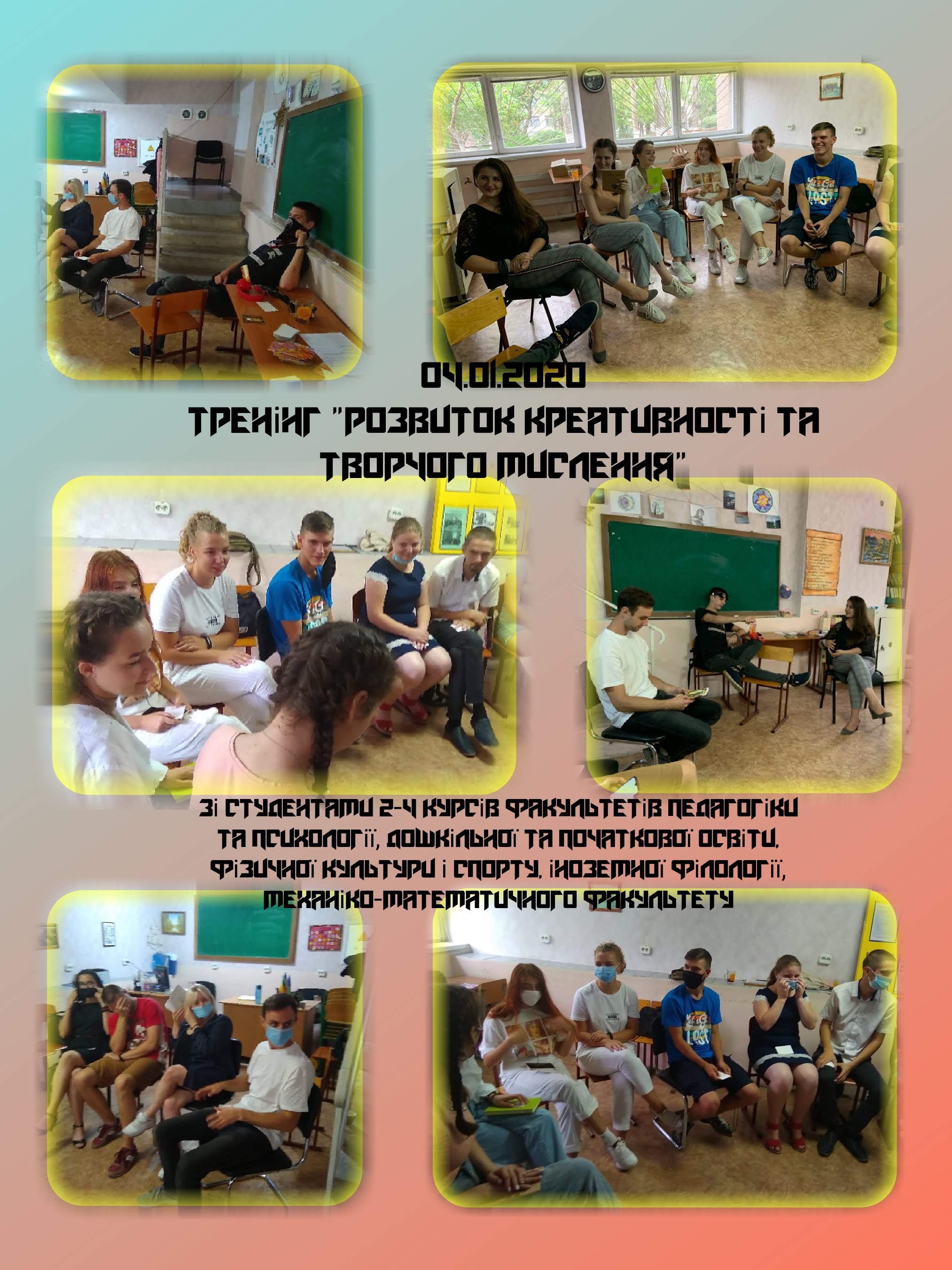 За запитом студентів 4 вересня 2020 року було проведено в рамках Центру психологічної служби тренінгове заняття на тему “Розвиток креативності та творчого мислення” для студентів 2-4 курсів факультетів педагогіки та психології спеціальності “Психологія” (317 та 417 групи), факультету дошкільної та початкової освіти спеціальності “Початкова освіта” (218 група), механіко-математичного факультету спеціальності “Середня освіта. Хімія” (240 група), факультету фізичної культури і спорту спеціальності “Тренер” (203 група), факультету іноземної філології спеціальності “Філологія англійська та німецька мова” (263 група).