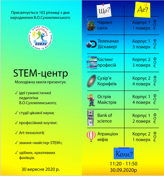 Запрошення на відкриття STEM-центру до 102-ої річниці з дня народження В.О.Сухомлинського Якщо ви знайшли помилку, будь ласка, виділіть фрагмент тексту та натисніть Ctrl+Enter.