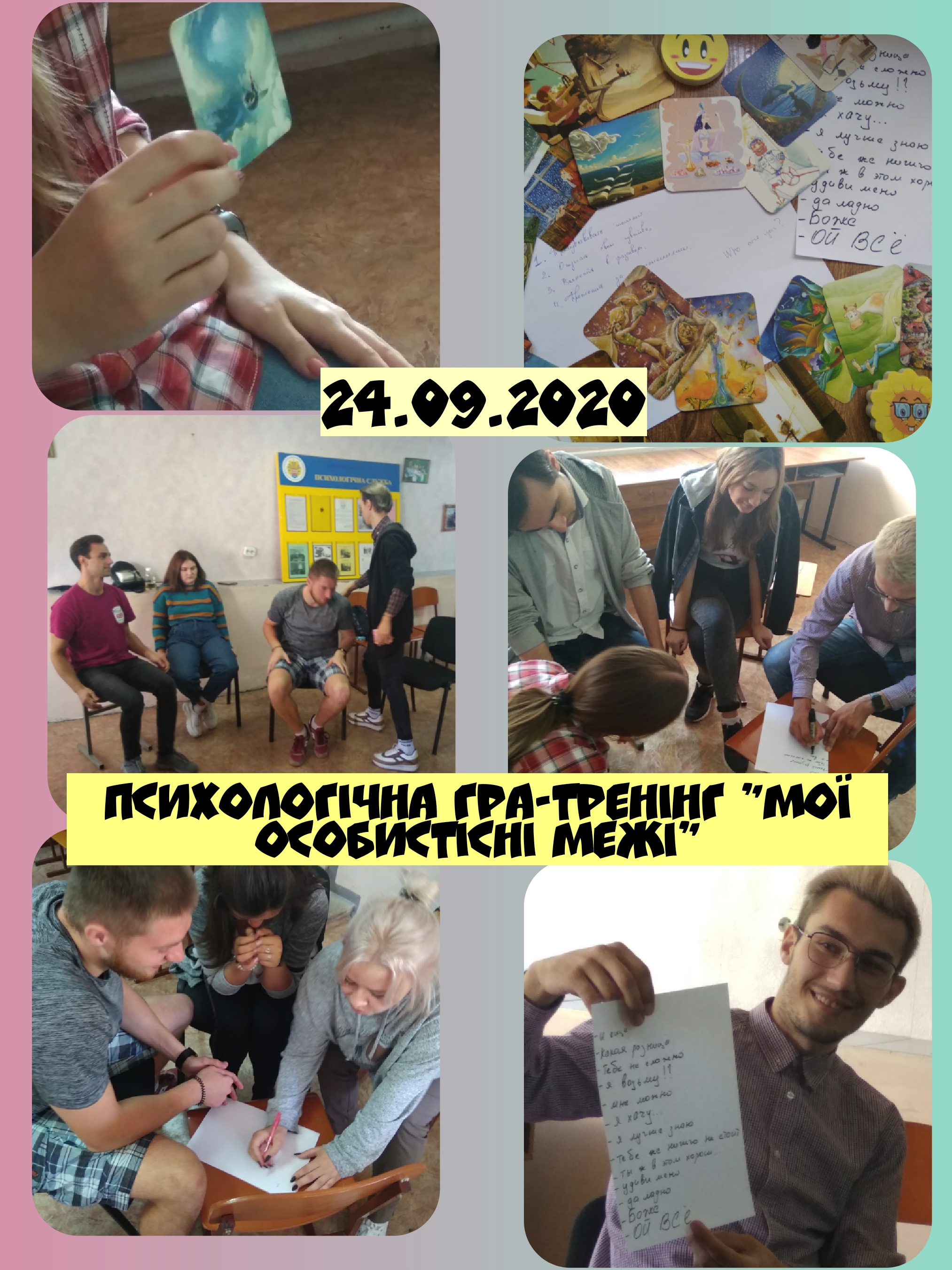 В процесі виконання вправ студенти зробили захоплюючі дослідження себе, образу свого особистого простору, своїх меж і звичних способів поводження з ними за допомогою метафоричних карт. Були присутні тілесні вправи на знаходження та усвідомленням своїх і чужих меж. Особливо сподобалася вправа на формування образу власних «кордонів» у вигляді будинку.