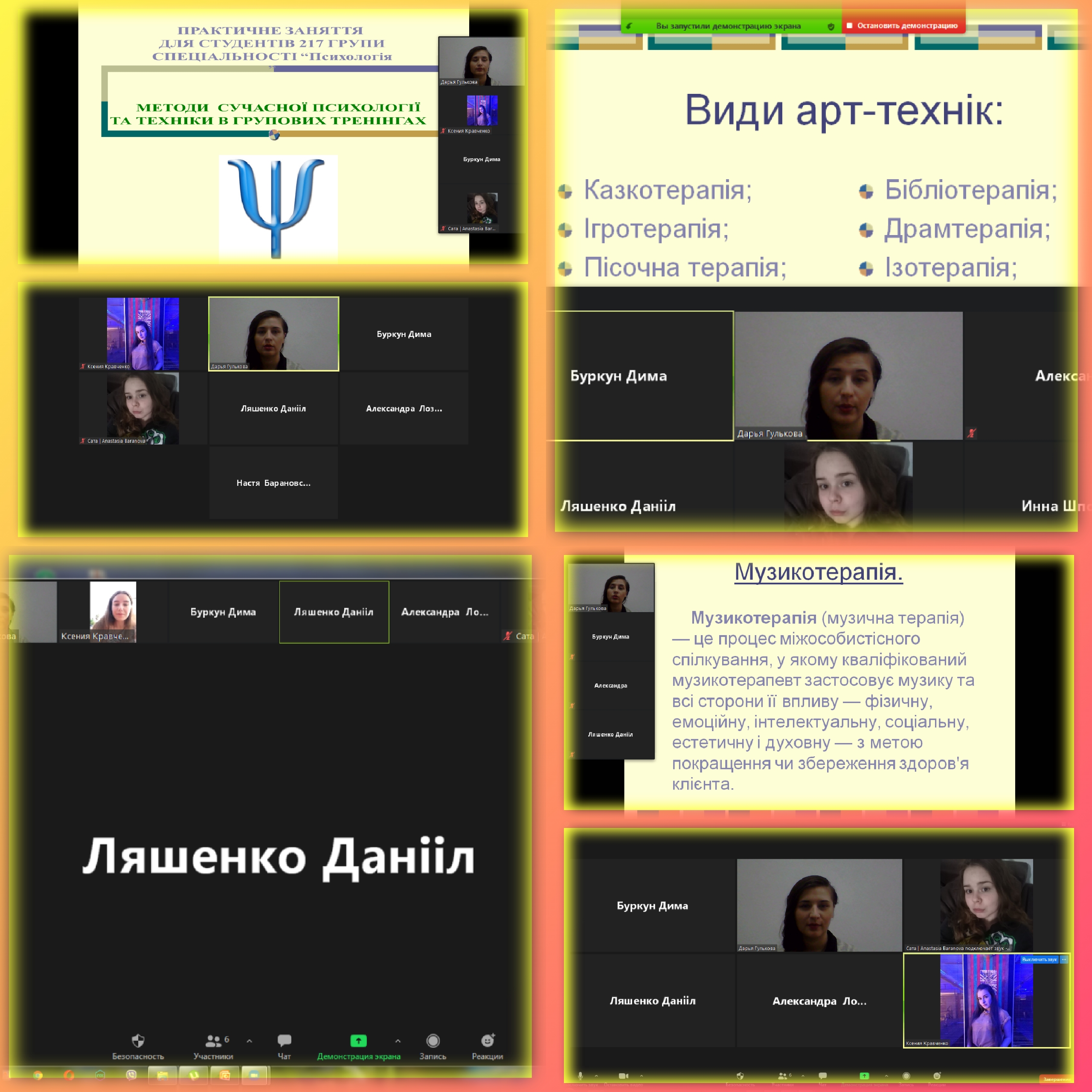 6 жовтня 2020 року відбувся онлайн майстер-клас з арт-терапії «Методи сучасної психології та техніки в групових тренінгах», у якому взяли участь студенти 217 групи спеціальності «Психологія» факультету педагогіки та психології Миколаївського національного університету імені В. О. Сухомлинського.
