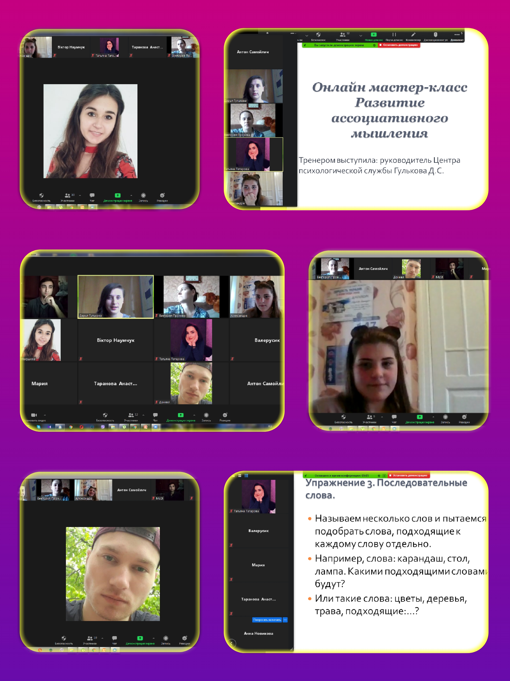 8 жовтня 2020 року був проведений онлайн-тренінг на тему «Розвиток асоціативного мислення» для студентів 3 курсу спеціальності «Історія та право», 2 курсу спеціальності «Спеціальна освіта. Логопедія» та 3-4 курсів спеціальності «Психологія» факультету педагогіки та психології, 2 курсу факультету фізичної культури і спорту, 2 та 5 курсів спеціальності «Комп’ютера інженерія» механіко-математичного факультету.