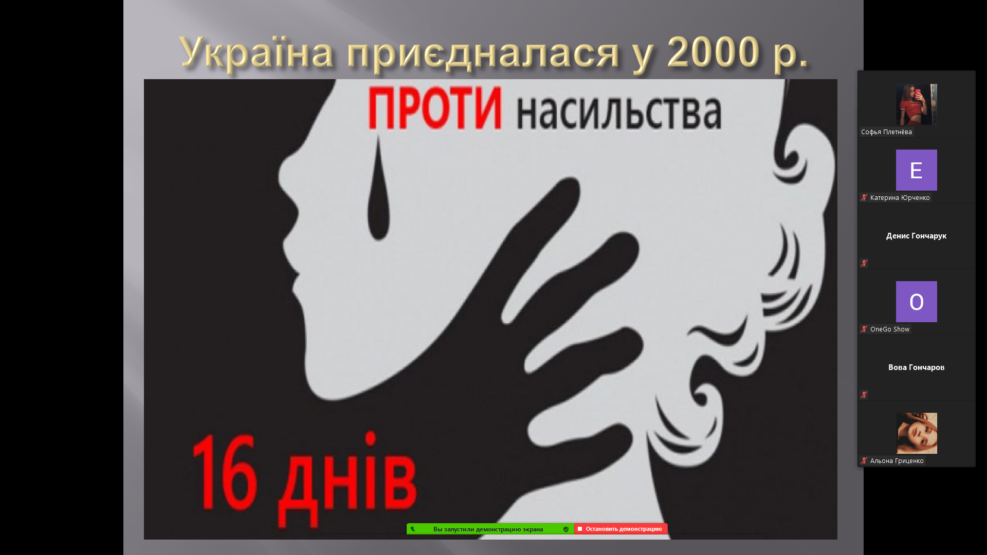 Тож саме в цей день, 25 листопада 2020 року, було організовано та проведено онлайн-тренінг під назвою «НАСИЛЬСТВУ НЕМАЄ ВИПРАВДАННЯ!» викладачами і студентами Відокремленого структурного підрозділу «Фахового коледжу Миколаївського національного університету імені В.О.Сухомлинського» на чолі з директоркою коледжу – кандидатом політичних наук Оленою Царенко.