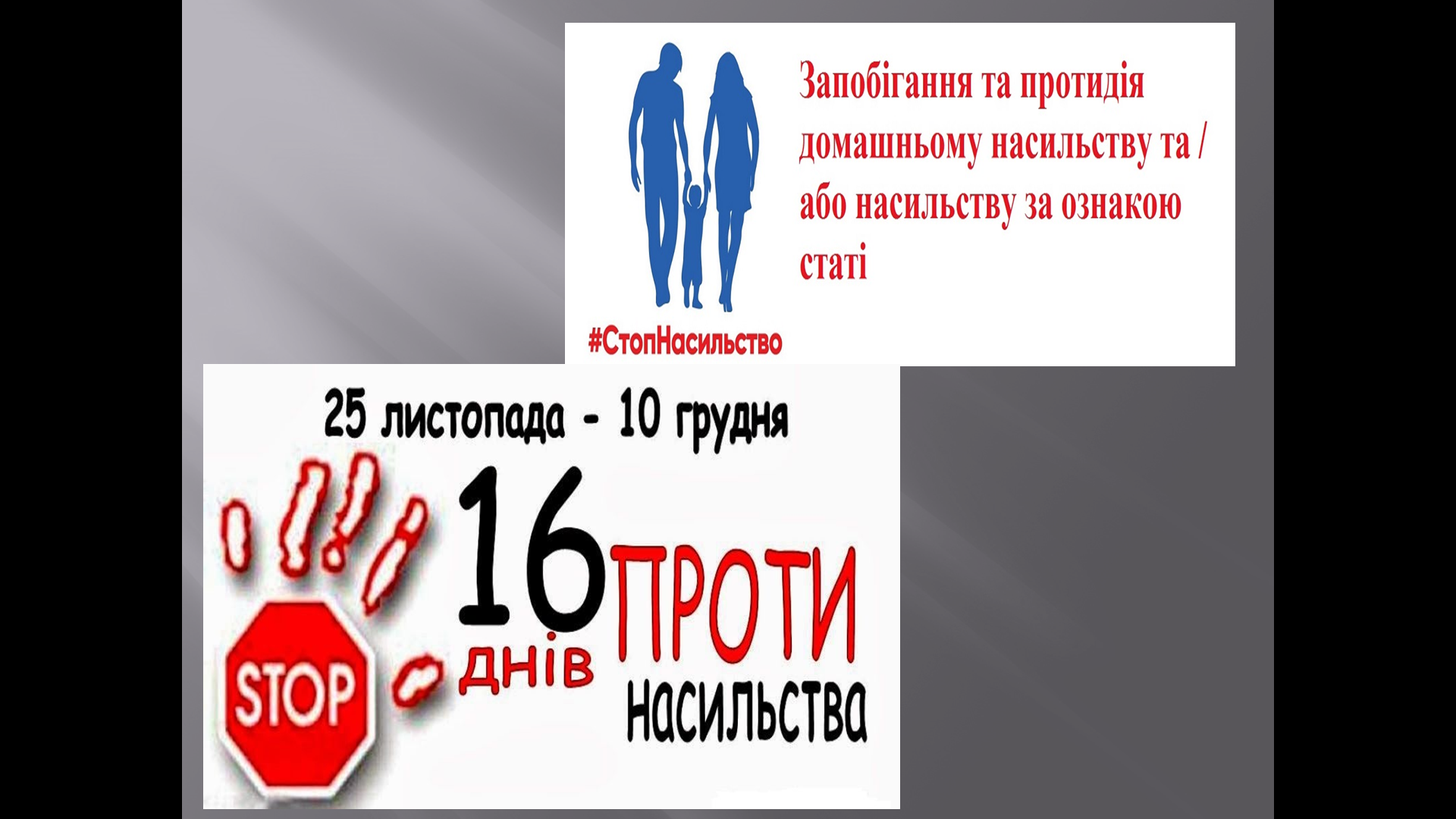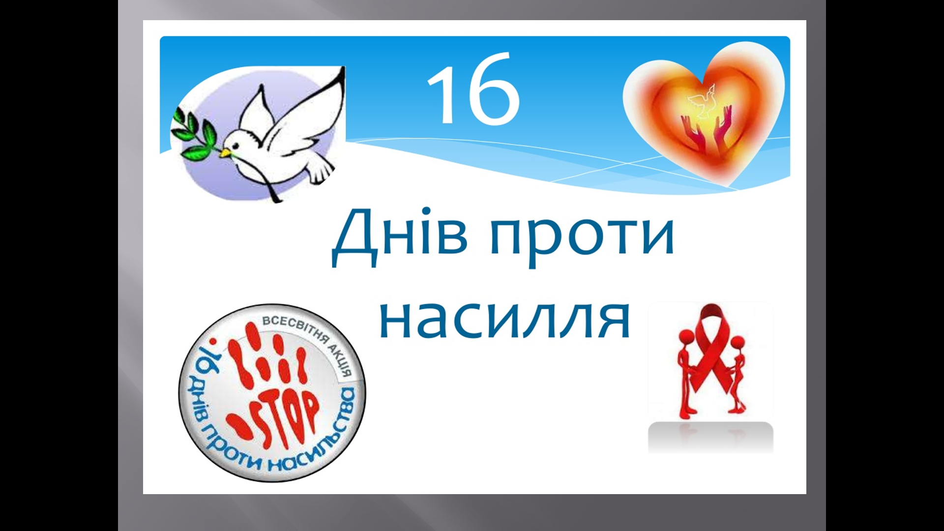 Всесвітня акція «16 днів проти насильства», яка щорічно проводиться в Україні і традиційно розпочинається у Міжнародний день боротьби за ліквідацію насильства щодо жінок – 25 листопада і триває до Міжнародного Дня прав людини – 10 грудня.